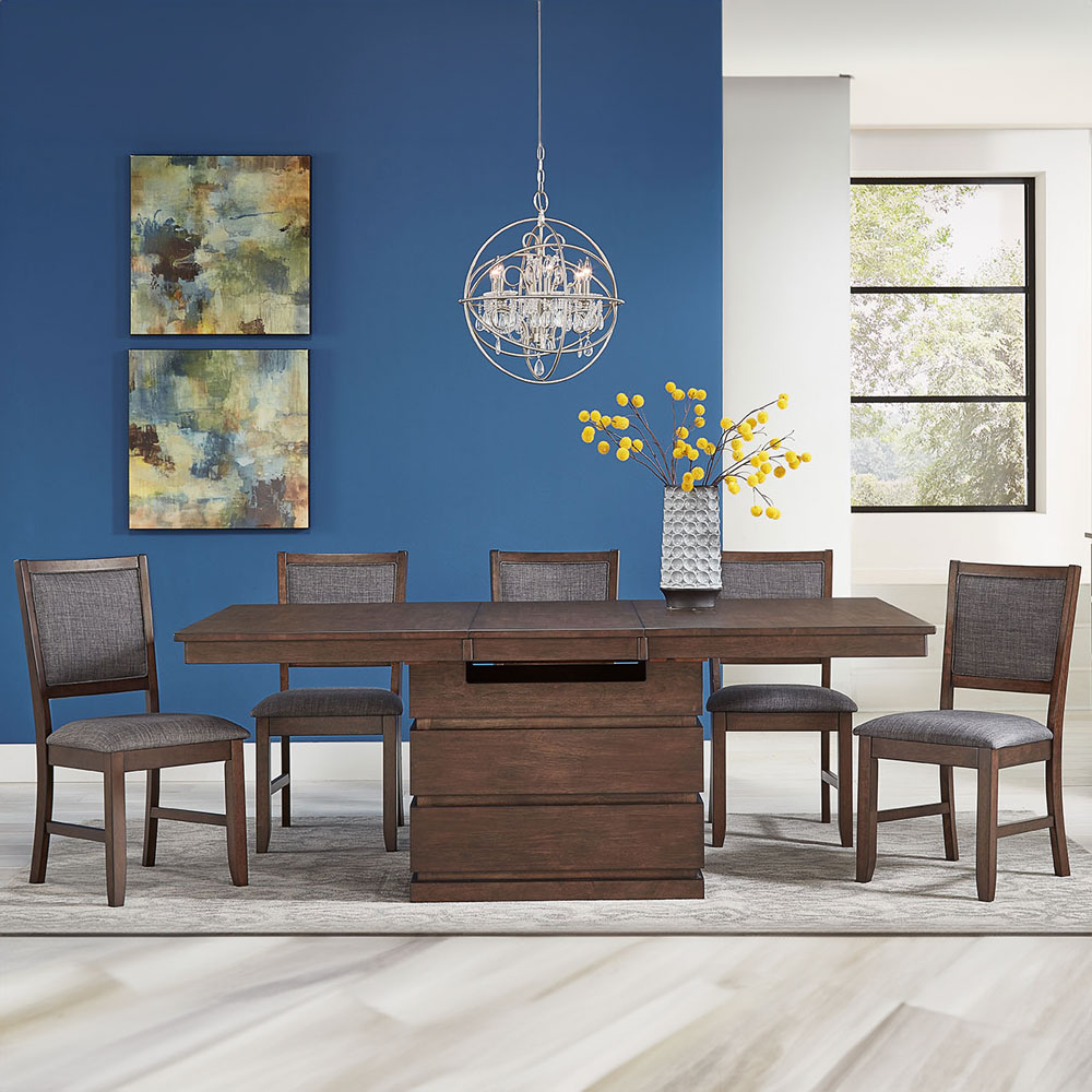 • 6 Streamlined Chairs Pair Light Mineral Gray Fabric With the Falcon Brown Finish To Balance This Modern Rustic Collection