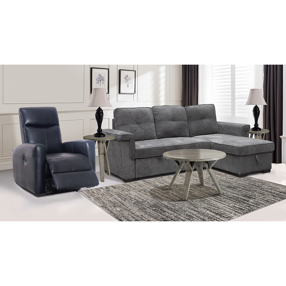 The AC Pacific Naomi 7-piece furniture package features a sleeper sofa chaise with charcoal grey fabric cover and a genuine leather charcoal power recliner. Included in this set are three matching tables with rich grey finish. Also included with the set is pair of Stylecraft metal table lamps with bronze-tone finish.
