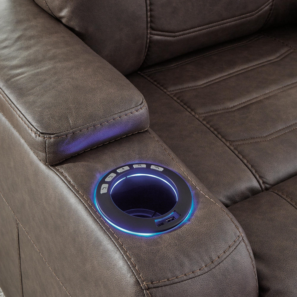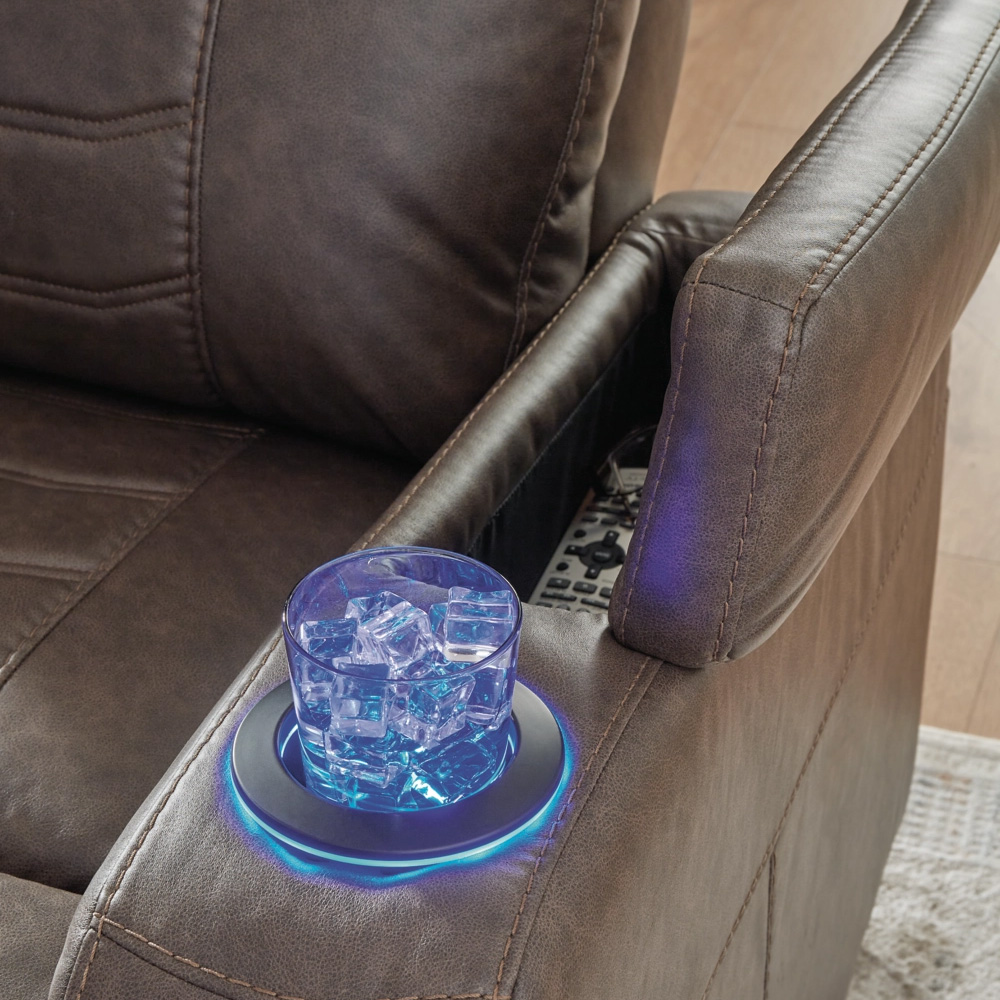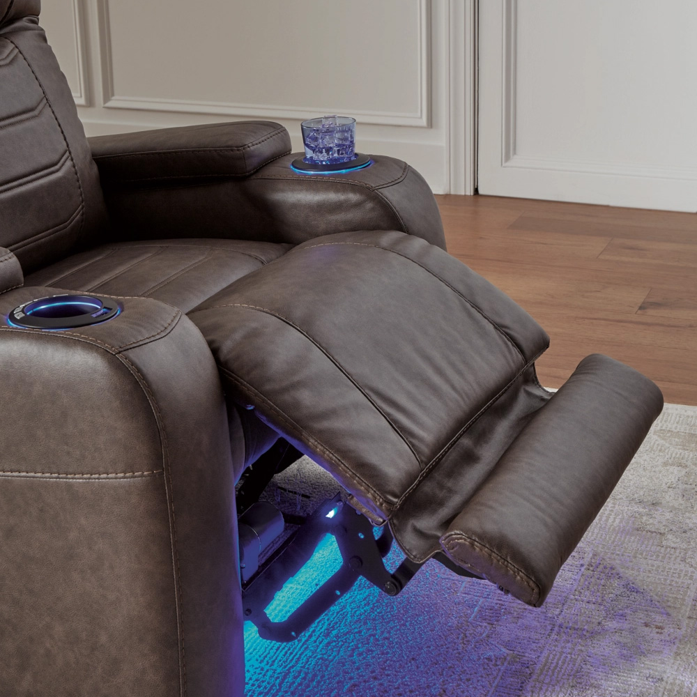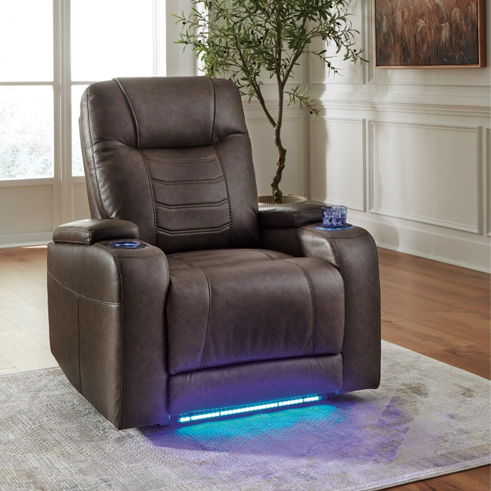 Elevate your movie nights with this power recliner. Its adjustable headrest ensures a perfect view of the TV no matter how far back you recline, and the extended ottoman offers extra space for maximum comfort. Stylish stitching and ambient LED lighting create a theater-style experience. Sit back, relax, and enjoy the show in complete comfort.