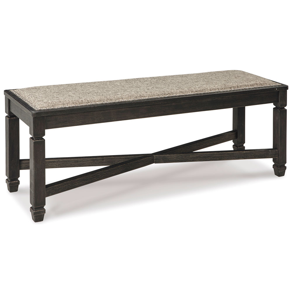 Invite your family into the heart of your home with the Tyler Creek upholstered dining room bench. X-shape stretcher and tapered legs are a sturdy foundation. Black finish is beautifully textured. Heavily woven fabric has a quality feel-good touch. Silvertone nailhead trim is decorative without all the fuss. This is trend-right urban farmhouse style.