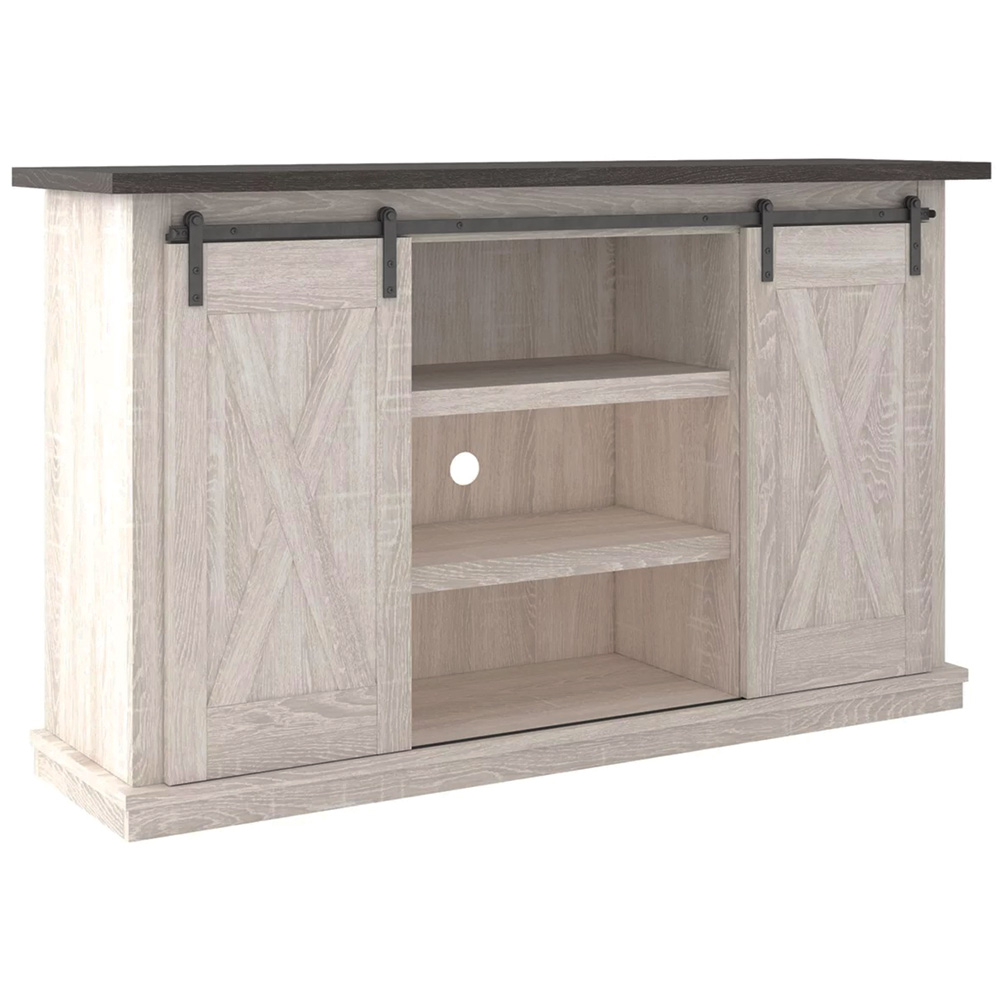 With its two-tone finish, cross-buck details and authentic charm, the Dorrinson TV stand is right in tune with your relaxed approach to high style. Beautifully made to accommodate your media equipment, it’s well equipped with adjustable shelving, cutouts for wire management and, of course, a pair of sliding barn doors you can center or place to the side. What a mastery in modern farmhouse living.