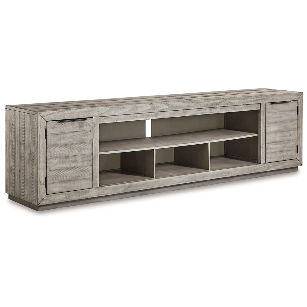 Balancing chic flair with a relaxed sensibility, the Naydell extra-large TV stand strikes just the right tone for rustic sophistication. Beautifully clean lines are subtly enhanced with relaxed distressing and saw marks for authentic barn wood character. You're sure to love the convenient open style for easy access to media equipment and accommodating pretty home accents.