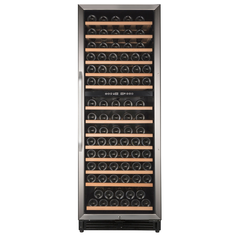 Keep wine chilled in this large 148-bottle capacity, dual-zone, wine chiller from Avanti. This wine fridge is ideal for the office, man cave, she-shed, bar, basement, or anywhere you want to beautifully store your wine collection. Easily view your wine choices through the glass door. This spacious wine cooler features wooden shelves that pull out, LED display lighting, and a security lock. The tempered glass door is reversible and the interior features specially designed shelves for Burgundy bottles. Select the right settings at the touch of a button and monitor the temperature /F> with the temperature monitor display.