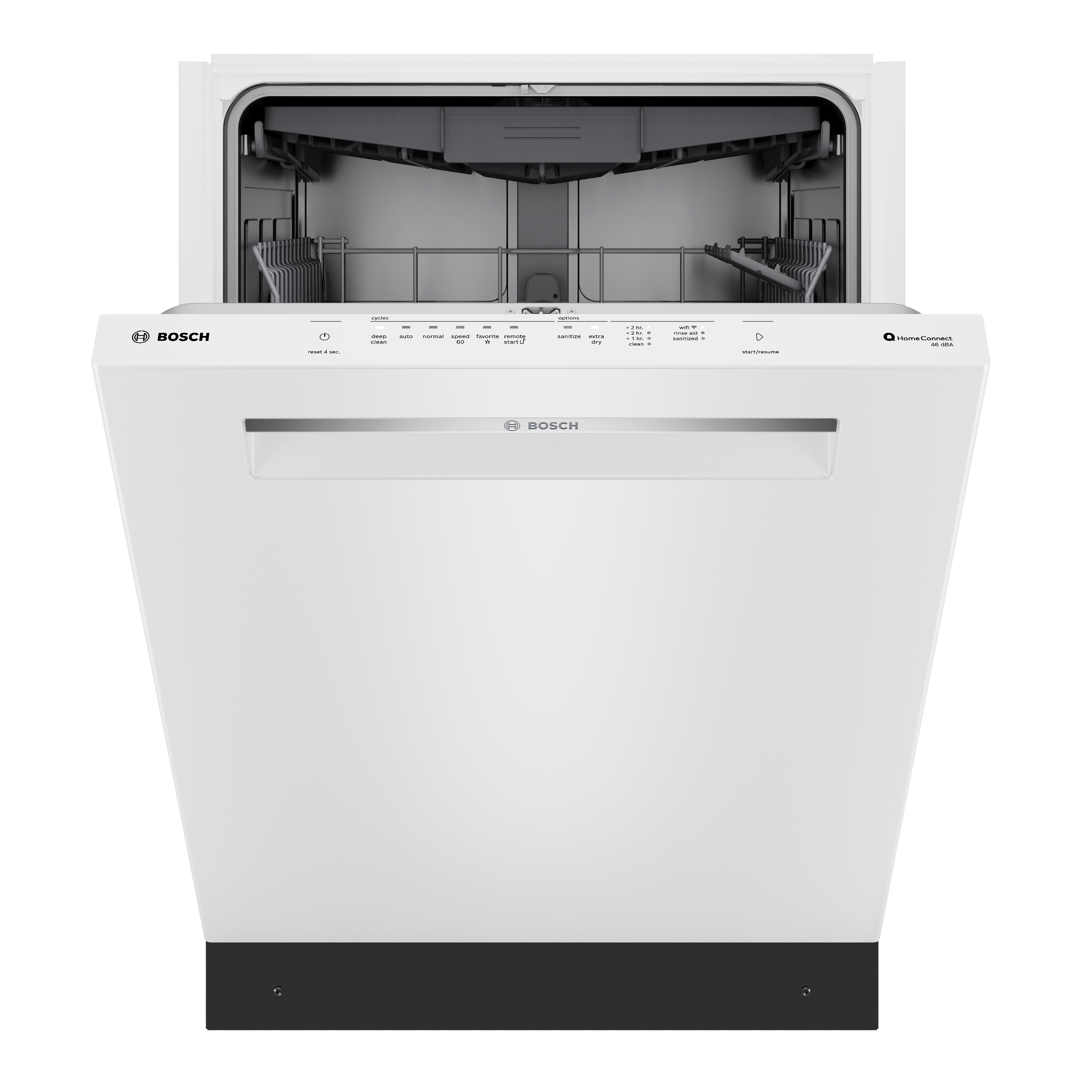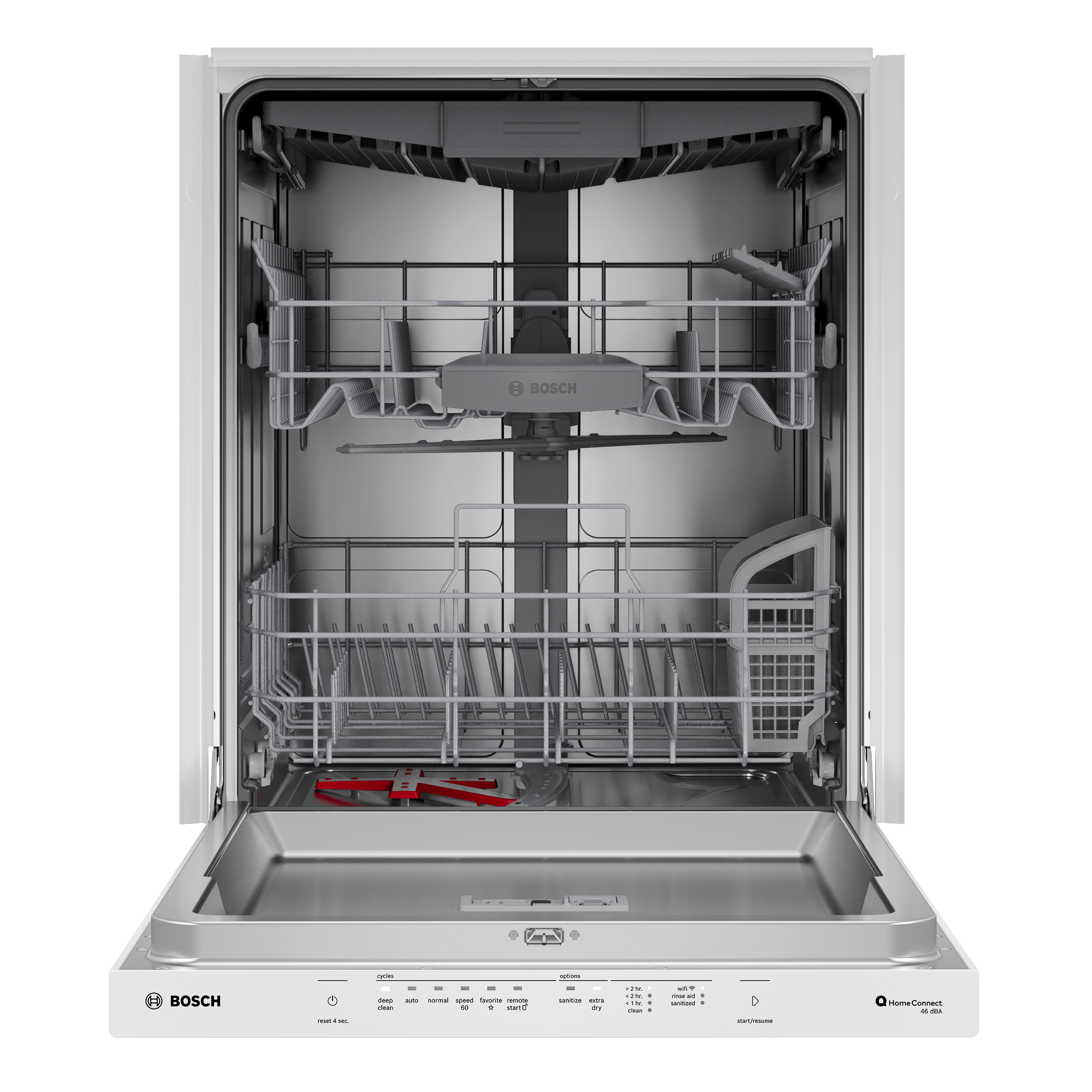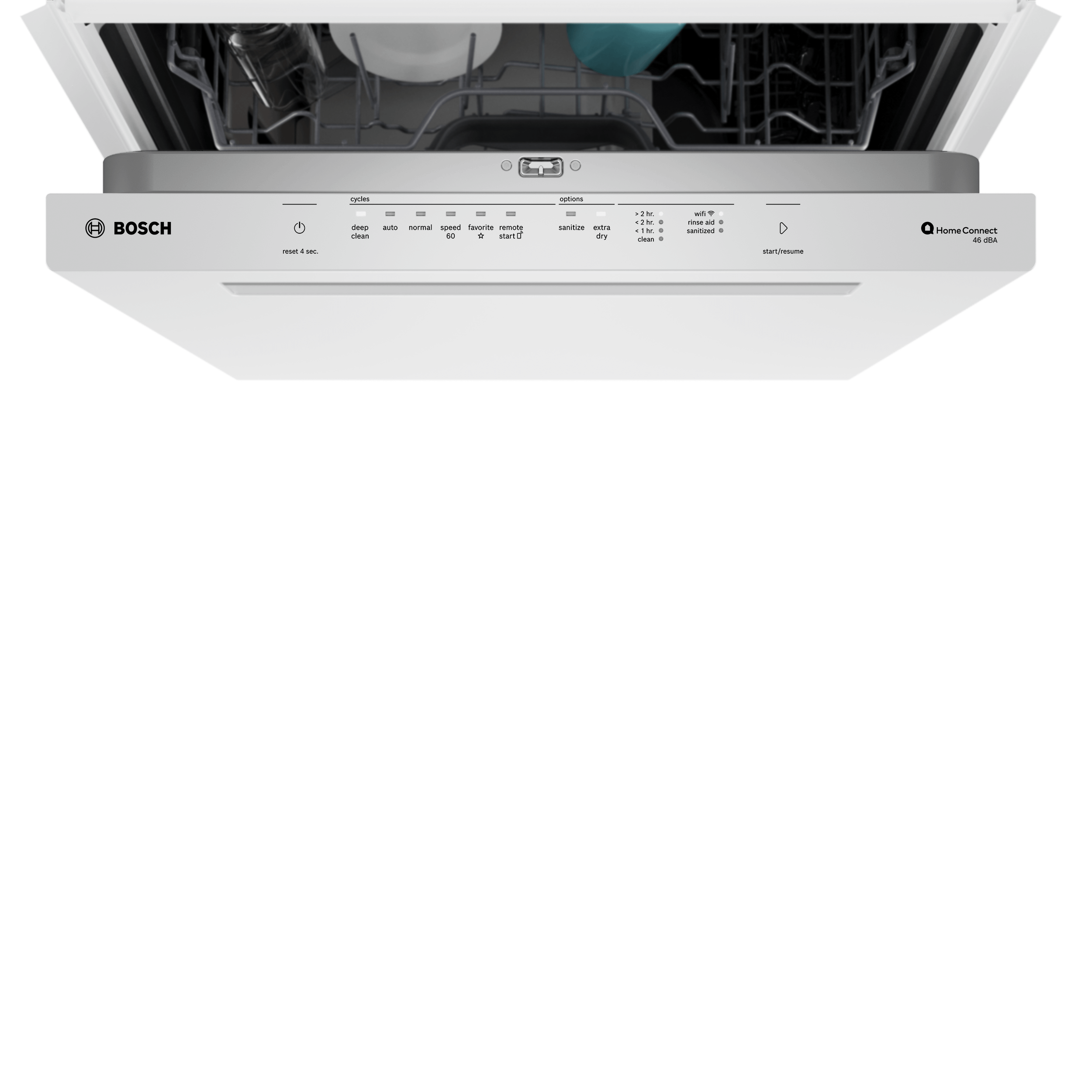 • Offers 5 standard wash cycles, including the following: Deep Clean, Auto, Normal, Speed60, Favorite, and 3 standard options, including: Sanitize, Remote Start, and ExtraDry. Plus, the ability to access additional wash cycles and options though Home Connect such as Delay Start, Delicate, Machine Care, and more.