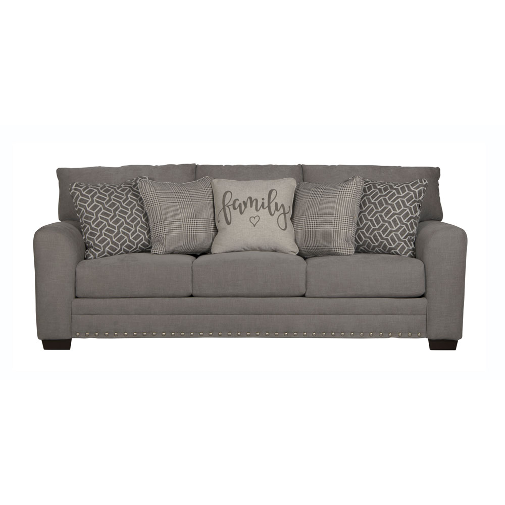 The Farmhouse Casual styling of Cutler offers a mix of fabric texture and design, brushed nickel decorative Nailhead trim, large solid wood legs and attractive throw pillows will welcome your guests and family home.
