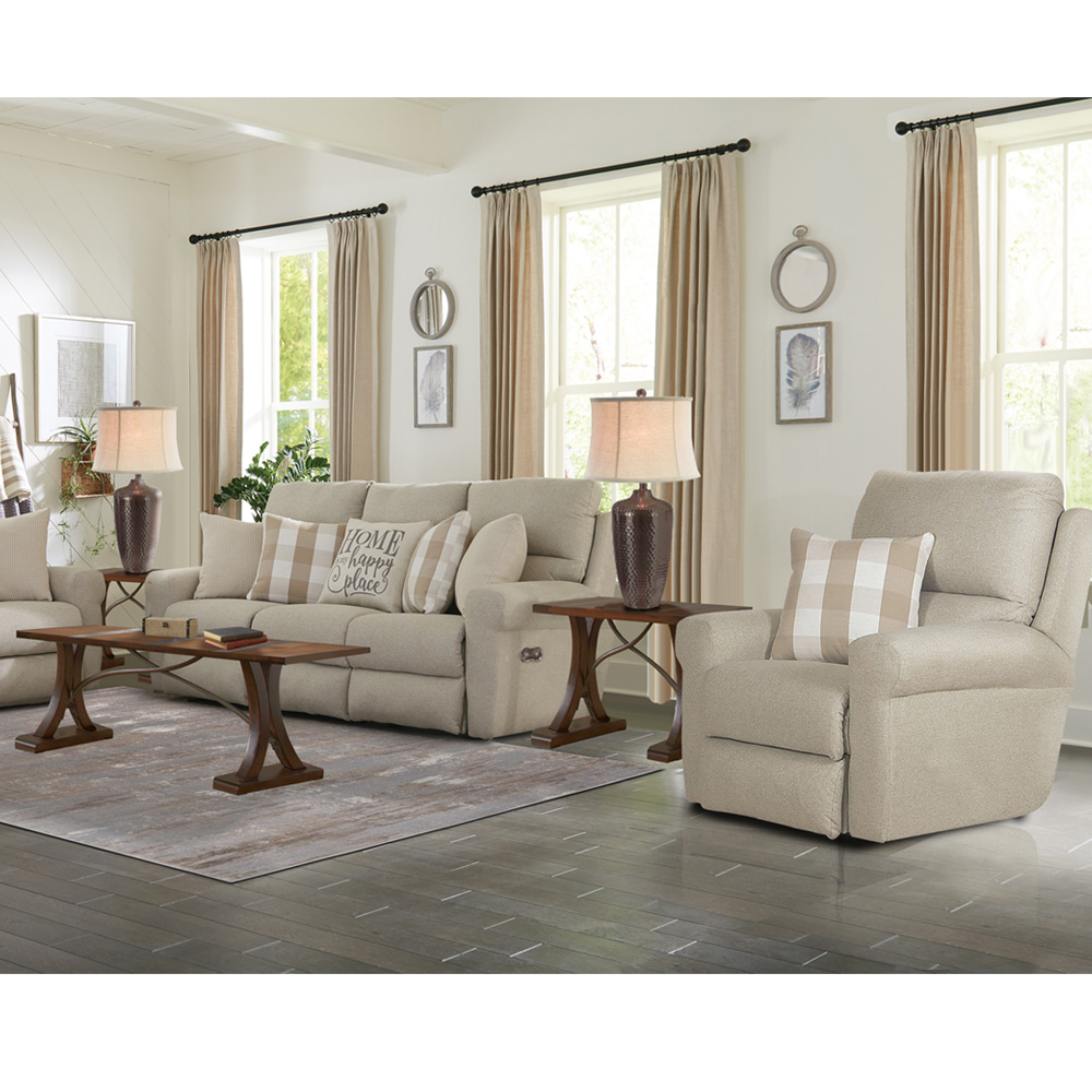 The Westport 7-piece furniture package features a beige fabric cover powered reclining sofa and powered recliner. Combined with one coffee table and two matching end tables. Also included with the set are two Anthony California table lamps.<