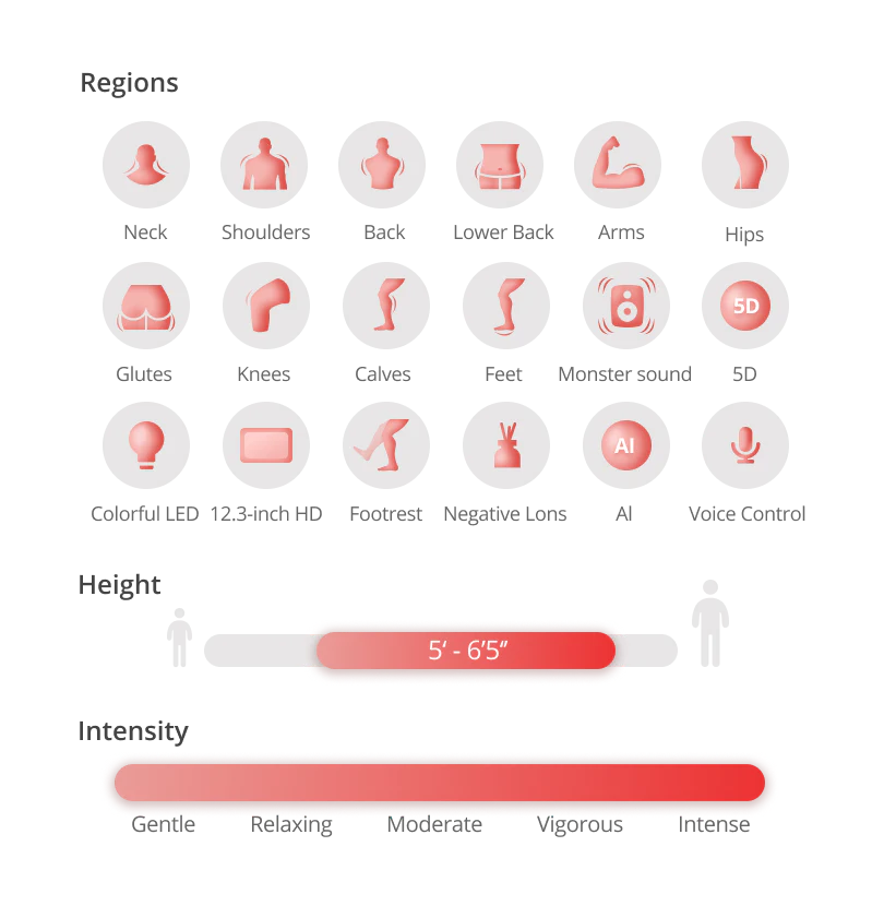 everything in a 4D massage chair, plus the addition of 27 precision pressure sensors. These smart sensor monitors in real-time how much force is being applied making sure the correct amount of pressure is applied to any part of your spine.