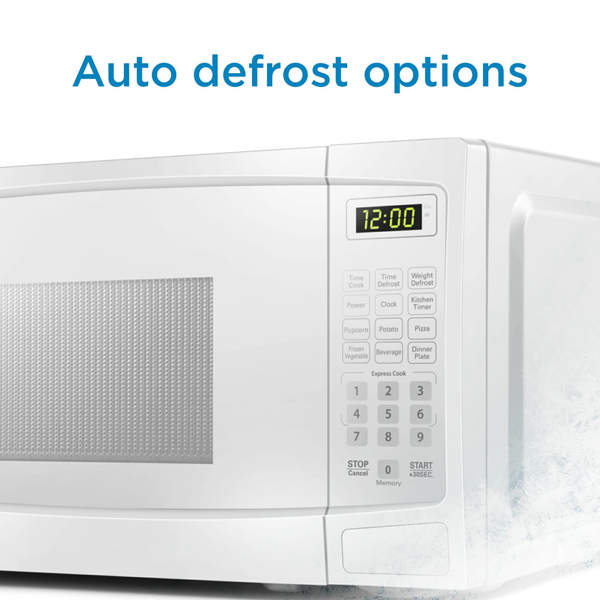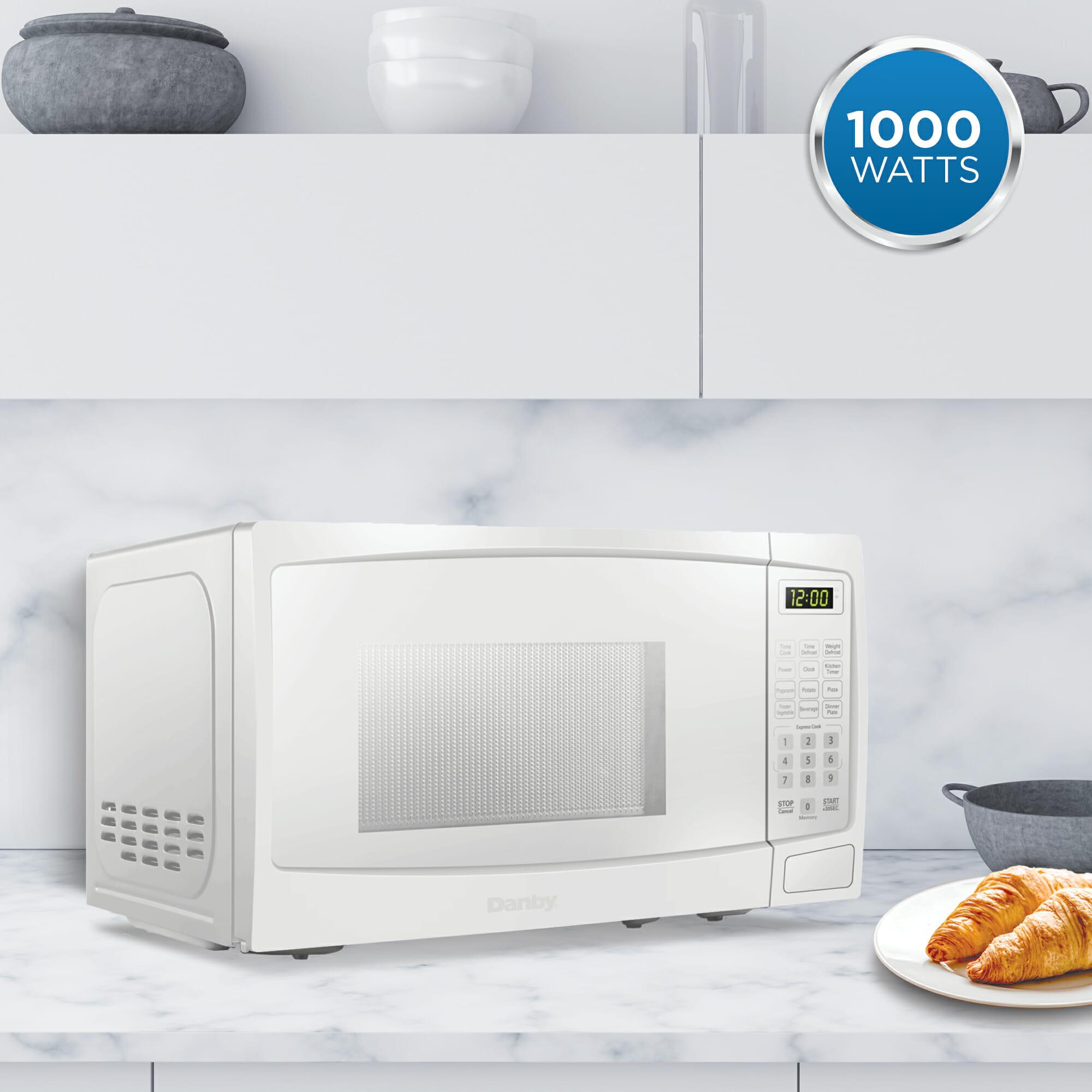 On a budget? This 1.1 cu. ft. countertop microwave by Danby is economical and practical! Available in black, white, or stainless-steel, this stylish model effortlessly fits your rooms existing dcor. Danby microwaves are well suited for dorm rooms, offices, cottages, or s. With 1000 watts of power, this model has six convenient auto cook options: popcorn, potato, pizza, frozen vegetables, beverage, and dinner plate. The one-touch auto defrost option simplifies your cooking needs, and the express cook buttons provide 1-6 minutes of cooking time. In addition, the child/control lock-out option guarantees a safe environment for your child!