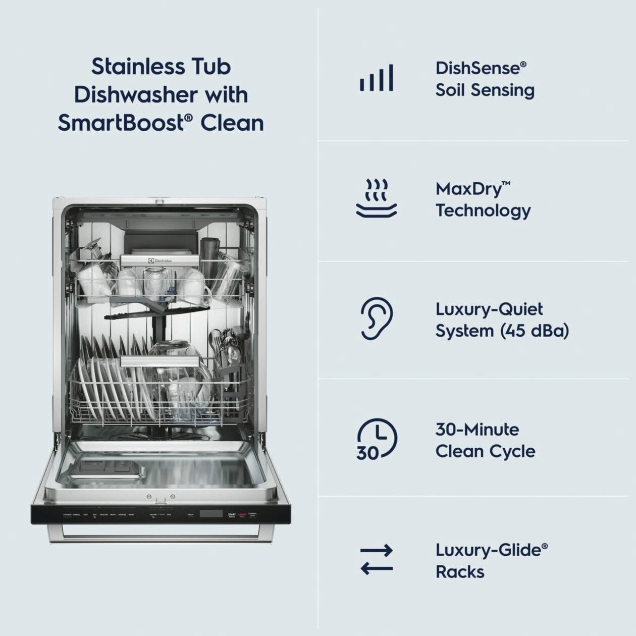 The Electrolux 24" Stainless Steel Tub Built-In Dishwasher with SmartBoost Clean Technology maximizes the power of your detergent by premixing it with water before it touches your dishes delivering powerful cleaning results and helping remove tough baked on foods. This ultra-quiet <45 dba> dishwasher also features Max Dry, our most powerful drying feature at the click of a button. When you're entertaining guests, dishes come out sparkling clean in between courses with our 30-Minute Clean cycle.
