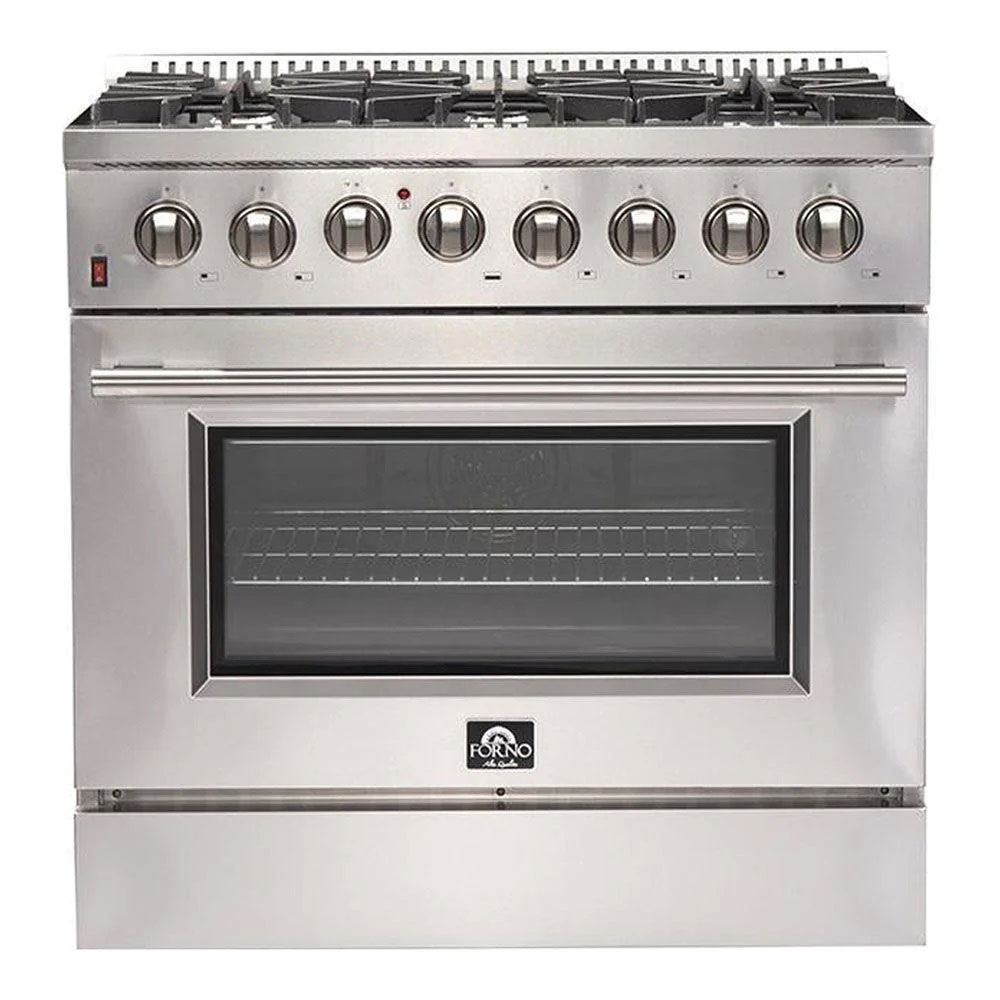 The Galiano 36" Dual Fuel Range blends professional style and performance with a durable stainless steel design. Featuring six sealed burners with a total output of 83,000 BTU, including a powerful 20K dual-ring burner for boiling or searing, it gently simmers delicate foods, such as chocolate and sauces. The cast iron grates provide stability and smooth pan sliding, while the 5.26 cu. ft. electric oven delivers 6,300 watts of power, making it perfect for baking, roasting, and broiling with true convection options. Included are two oven racks, an LP conversion kit, and elegant zinc-coated metal knobs with bezel rings that retain their beauty.