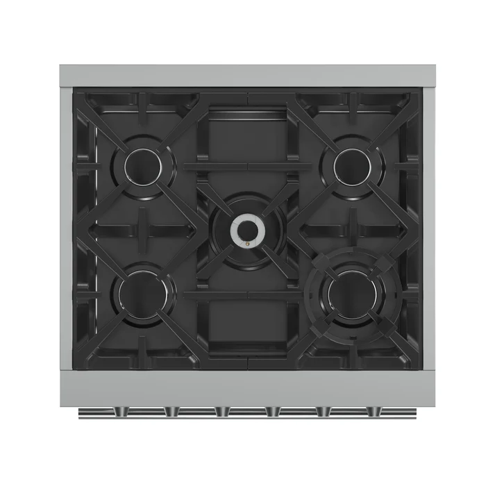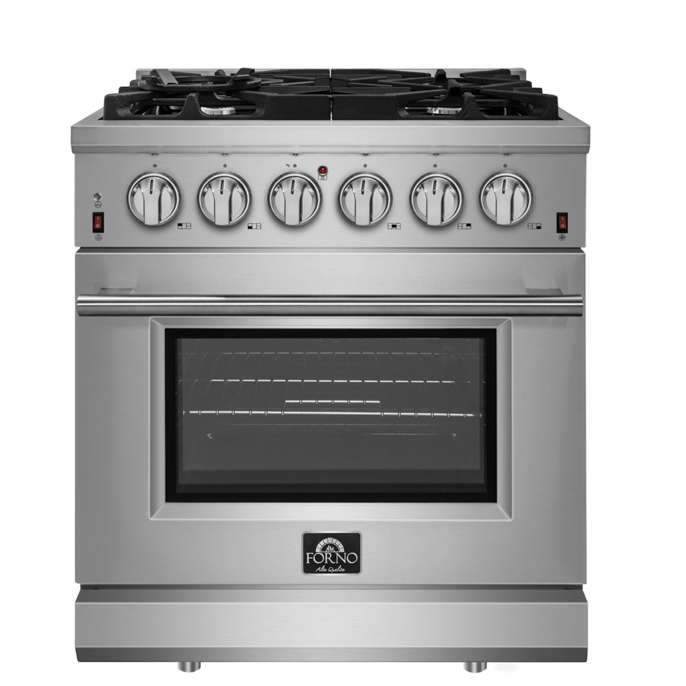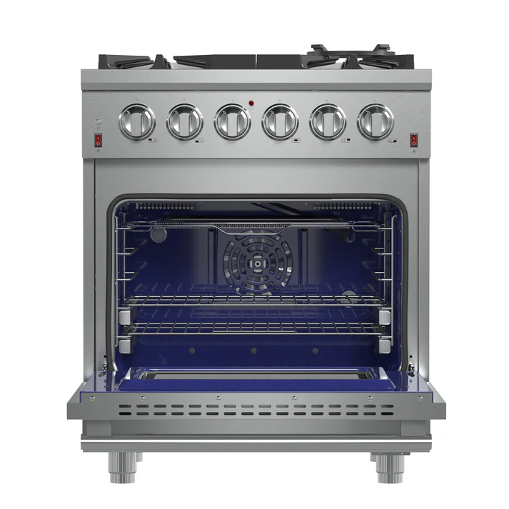 The Forno Massimo 30 Inch Gas Range harmonizes professional style and 304-grade stainless steel durability. Its 5 sealed burners, totaling 68,000 BTU, include a precision 20,000 BTU dual-ring burner that can simmer at 1,000 BTU. Continuous cast iron grates ensure stability on the enamel surface. The 4.32 cu.ft. convection oven, with a blue enamel interior and 3-layer glass window, reaches 30,000 BTU for versatile cooking. It features 2 telescopic racks, an air fryer kit, a wok support, a reversible griddle, an LP conversion kit, and durable zinc-coated metal knobs. Elevate your kitchen with performance, convenience, and enduring elegance.