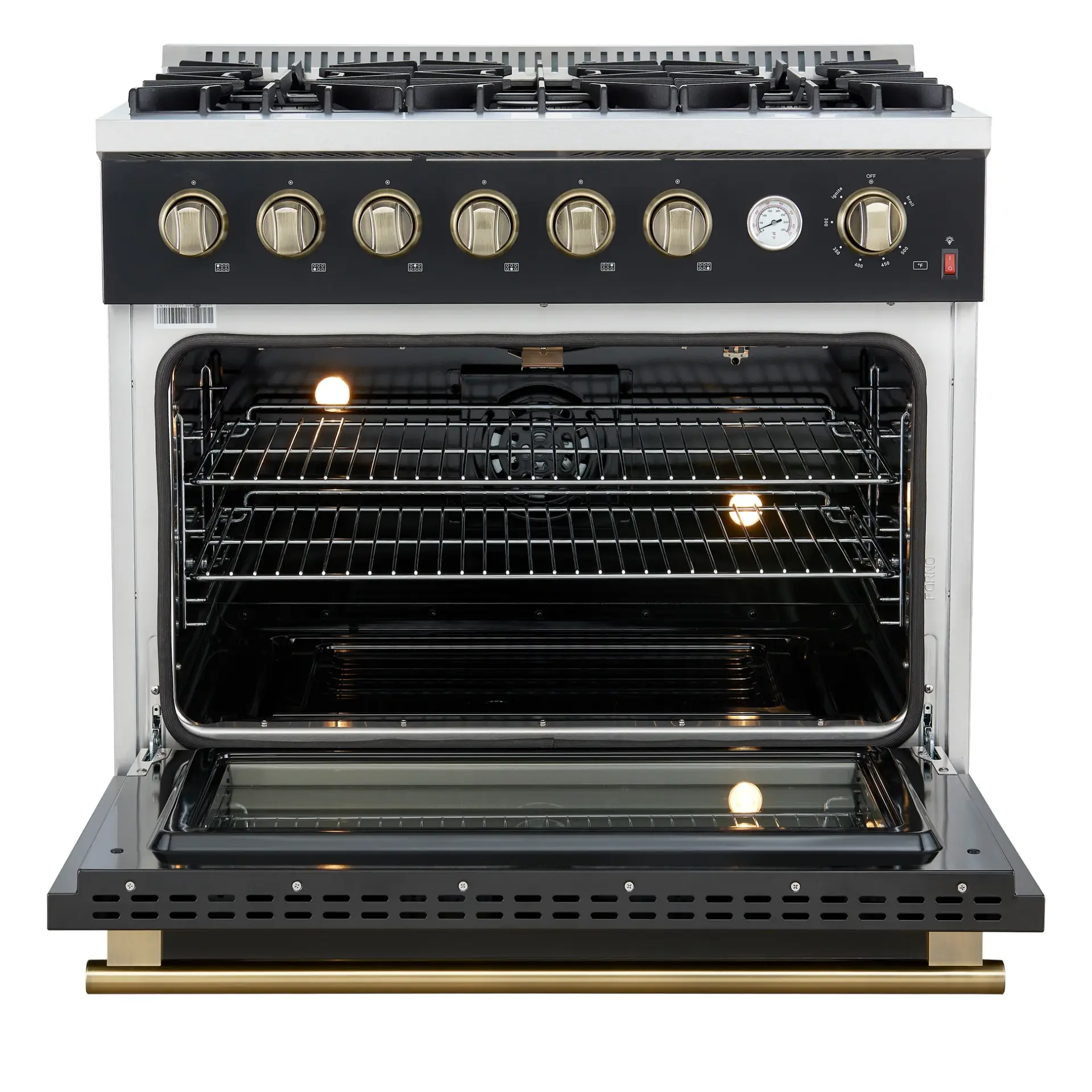 Upgrade your cooking with the Marco 36" Alta Qualita Gas Range in black – designed for home chefs who value performance and reliability. This 36" gas range features four sealed burners, including a 67,000 BTU dual-ring burner, perfect for rapid boiling, searing, or delicate simmering. The 5.36 cu. ft. convection oven, equipped with a powerful 26,000 BTU output, ensures even baking and roasting for every meal, from quick weeknight dinners to gourmet dishes. Durable cast iron grates provide stable cookware support and smooth movement, while the black enamel oven interior resists stains for easy cleanup.
