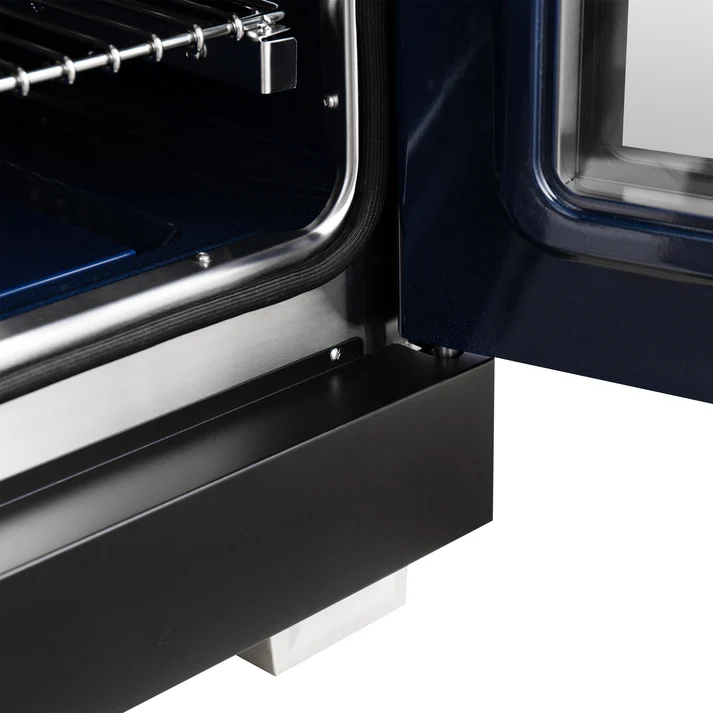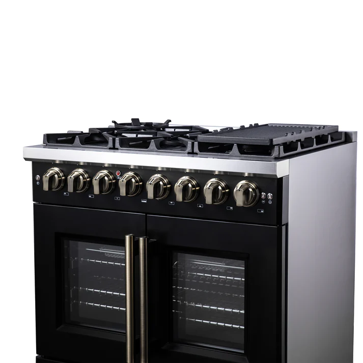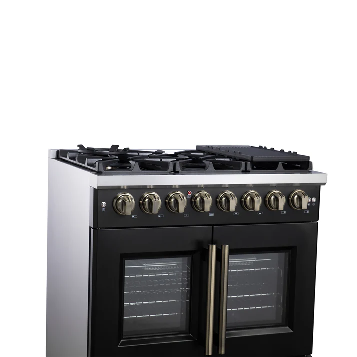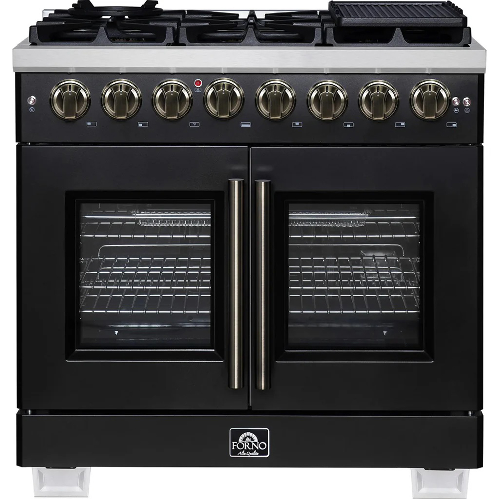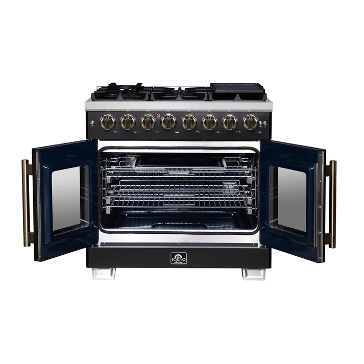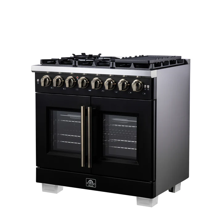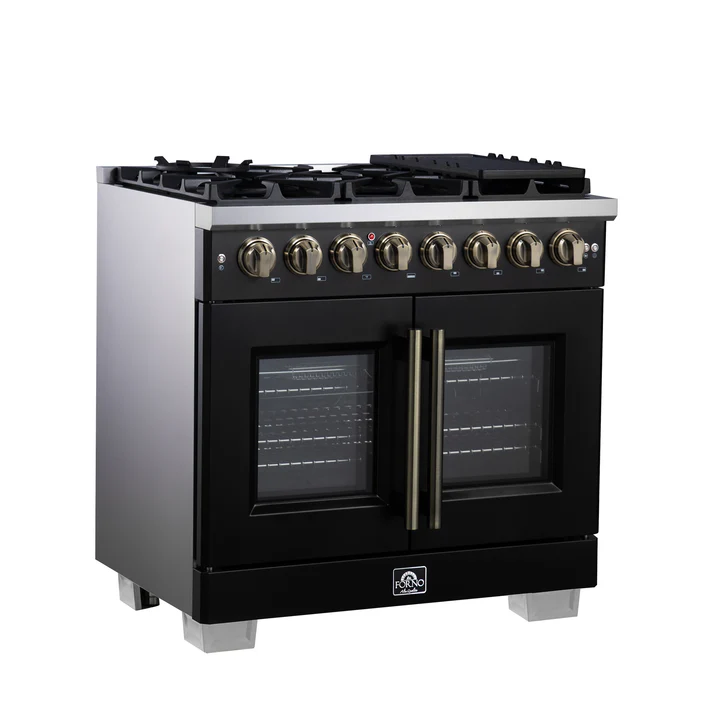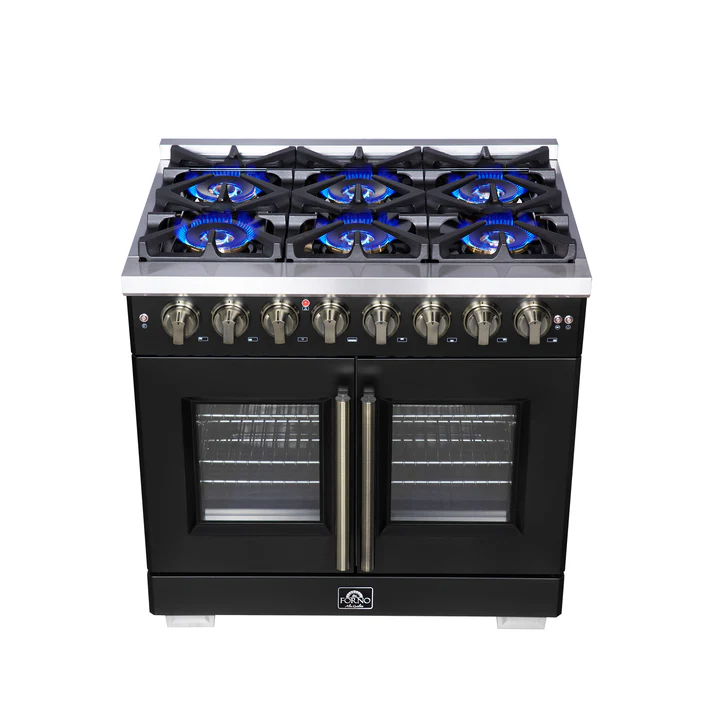 The Forno Capriasca 36 Inch French Door Dual Fuel Range in black with antique brass accessories brings professional style and high performance cooking into your home kitchen. Its signature French doors open outward, providing up to 12 inches of extra clearance for easier oven access. The range top features six sealed dual-ring brass burners with a powerful 120,000 BTU total output, offering the flexibility to achieve both intense searing and delicate simmering for sauces or melted chocolate. Heavy duty continuous cast iron grates ensure stability and smooth movement of cookware, while the recessed enamel cooktop cavity contains spills for easy cleanup. Inside, the 5.36 cu. ft. true convection oven delivers 6,300 watts of cooking power for fast, precise, and consistent results. A speckled blue enamel interior enhances durability and makes maintenance simple, while the triple-layer glass oven door window allows clear visibility without losing heat. Every detail is designed for performance and convenience, with included accessories such as an LP conversion kit, three stainless steel telescopic oven racks, wok support, reversible griddle, rotisserie kit with skewers, and an air fry basket with rack and drip pan.