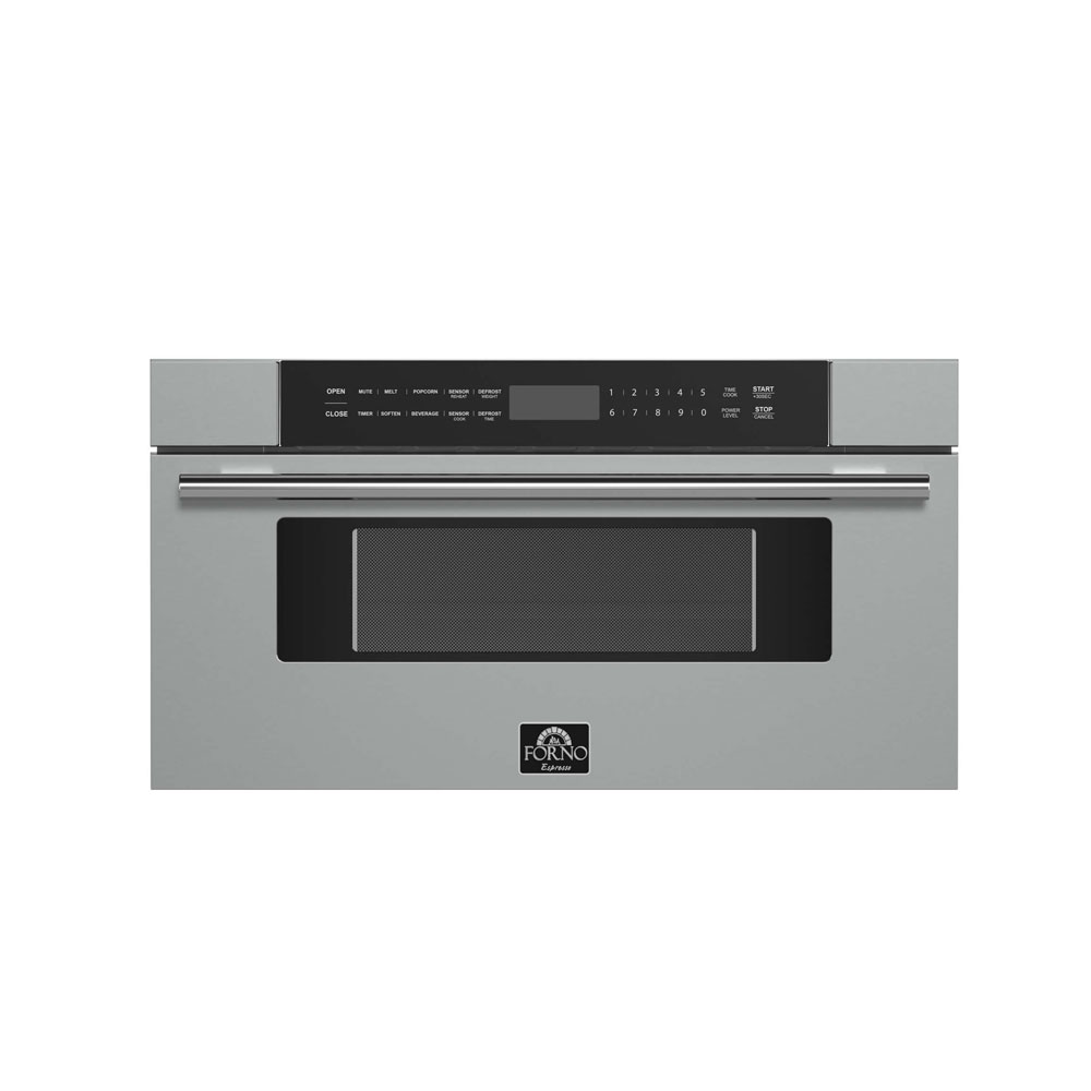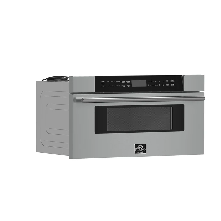 Upgrade your kitchen with the Forno Capolivera 30" Microwave Drawer, designed for effortless cooking. Featuring a 1.2 cu. ft. capacity, this stainless steel microwave with black accents delivers 1,500 watts of power for fast, even heating—boiling water in just 1 minute and 50 seconds. With 11 power levels, you can precisely control cooking temperatures for everything from reheating to gourmet prep. Glass touch controls and an LED display offer a modern, user-friendly experience, while pre-programmed settings make it easy to melt butter, chocolate, and more. Enjoy versatile cooking modes, including defrost, popcorn, and beverage heating. The spacious interior accommodates 7-inch coffee mugs and 16 x 16-inch dishes, making it perfect for everyday use.