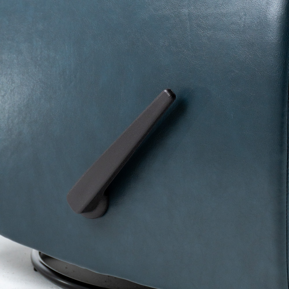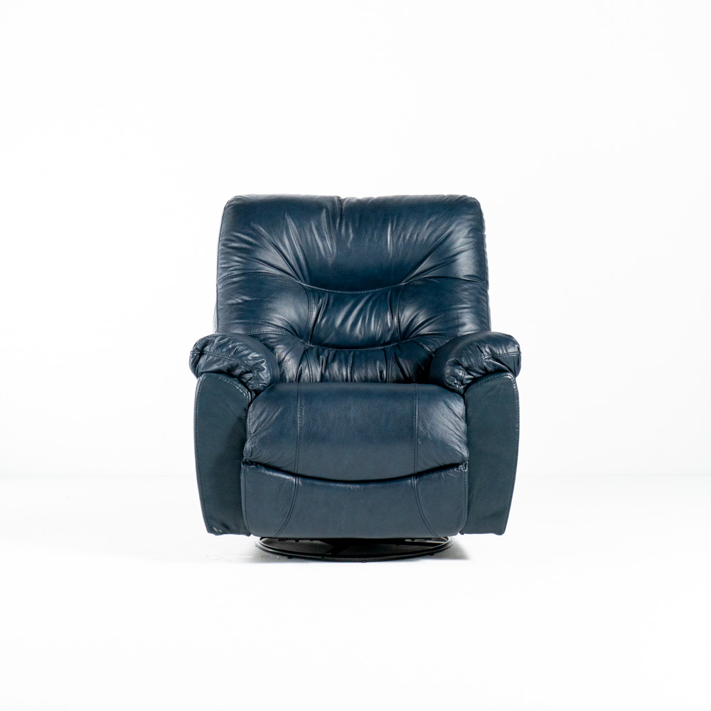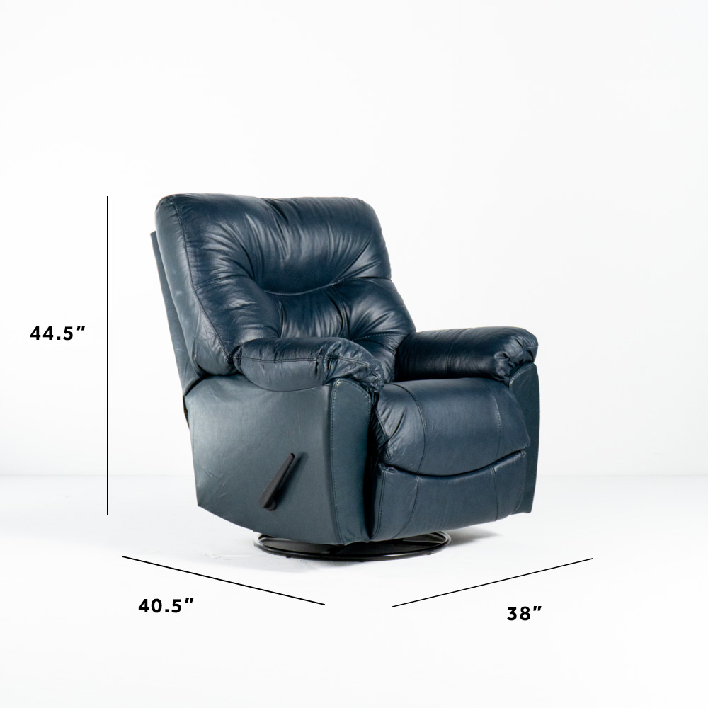The 4595 Trilogy Leather Swivel Rocker Recliner offers the perfect blend of comfort and style. Upholstered in luxurious navy leather, this chair features a cradled-back design, 100% gel-blended cushions, and an effortless reclining mechanism for ultimate relaxation. Proudly crafted in the U.S.A., it also includes a smooth swivel and rocking motion, making it an ideal spot to read, nap, or watch the game.