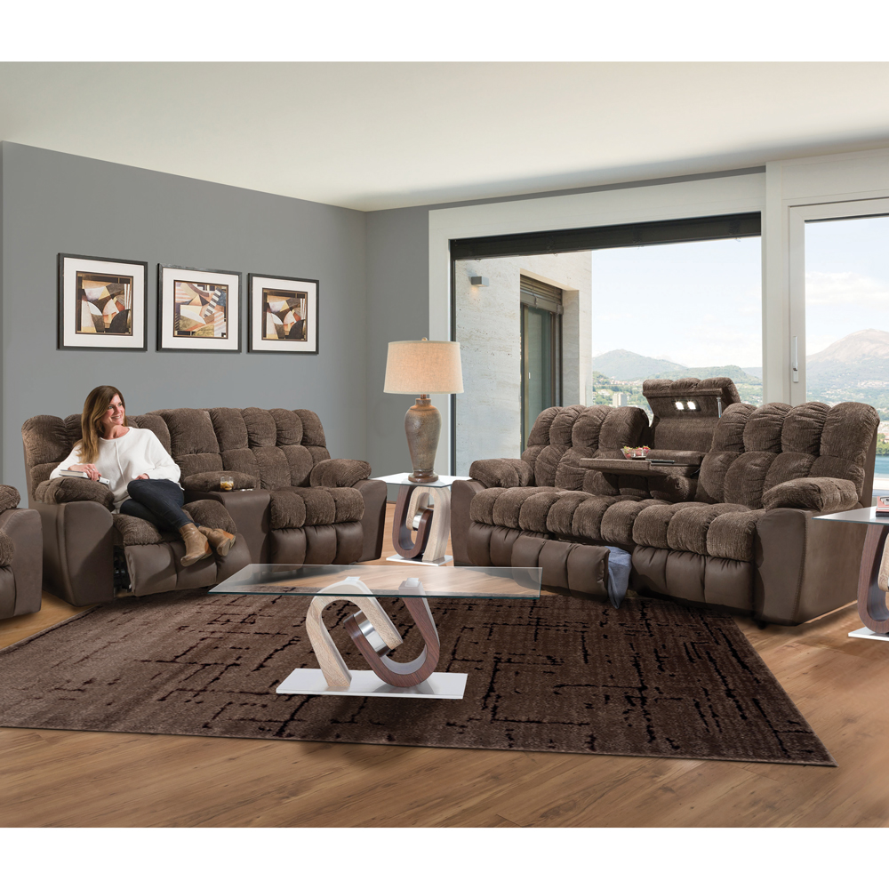 The Franklin Westwood 2-piece package features a matching godiva chocolate fabric reclining sofa and reclining love seat.