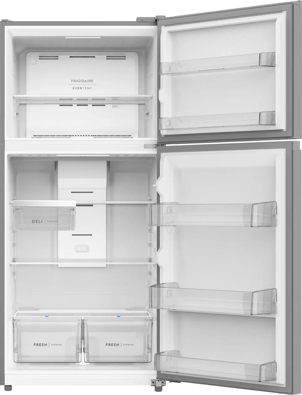 This Frigidaire 19 cu. ft. top freezer refrigerator includes spacious interior storage options designed for busy families, including generous door bins, adjustable full-width glass shelving, and a sliding deli drawer. Our humidity-controlled crispers keep produce fresh for longer, allowing you to waste less and save money.