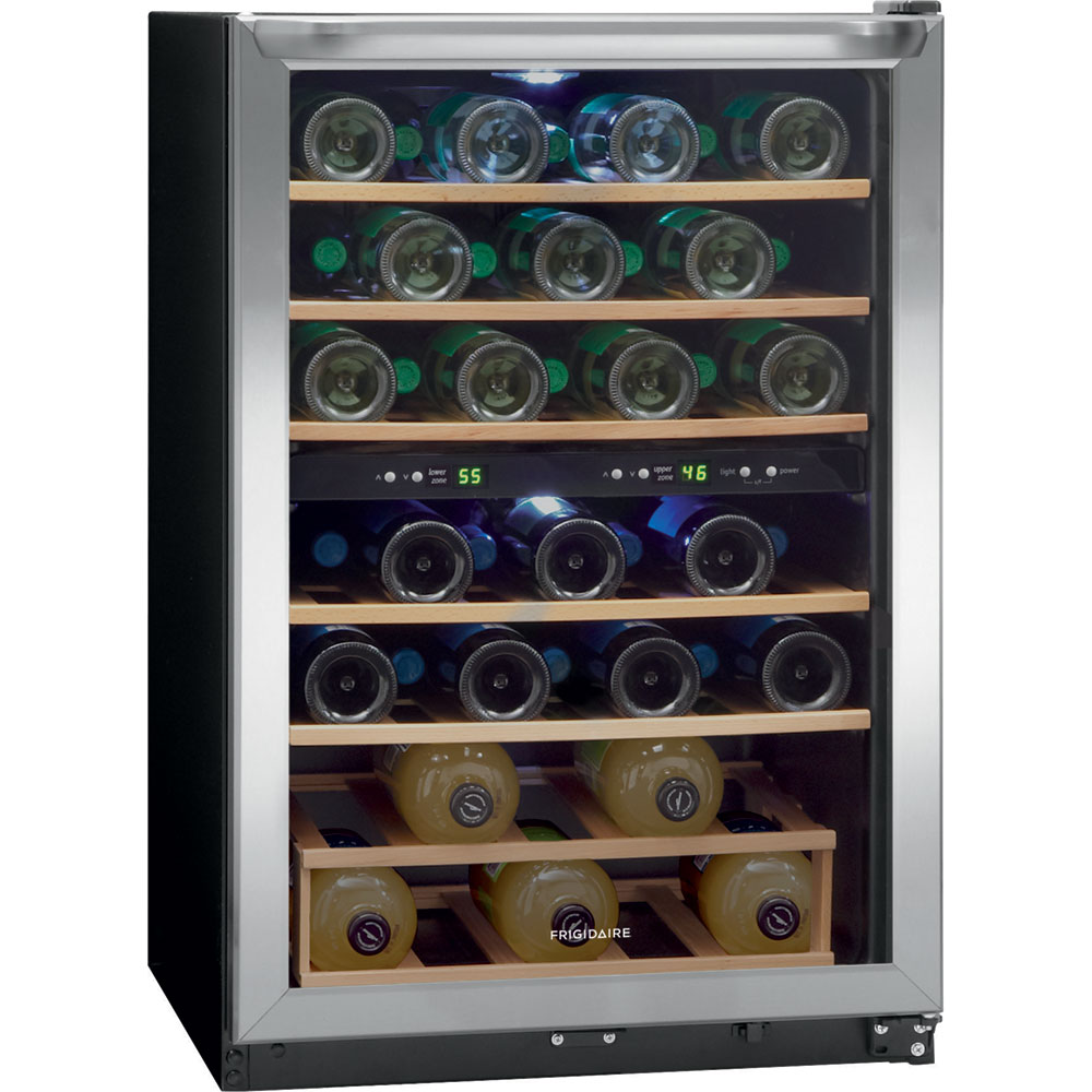 This Frigidaire wine cooler holds up to 45 bottles and offers two temperature zones to keep your favorites at the perfect temperature. The sleek design with the stainless-steel door, tinted window and natural wood shelving will complement your room and our reversible door gives you the flexibility to adapt and ensure it's a perfect fit.