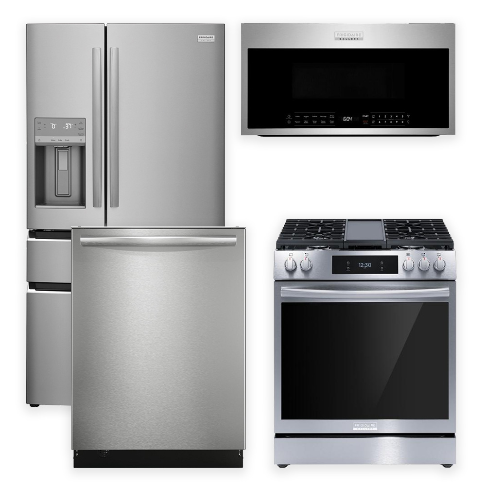 Upgrade your kitchen with this Frigidaire Gallery appliance package. It includes a French door refrigerator, a gas convection range, an over-the-range microwave, and dishwasher. Designed with Smudge-Proof™ stainless steel and easy-to-use features, it adds both style and convenience to your home.