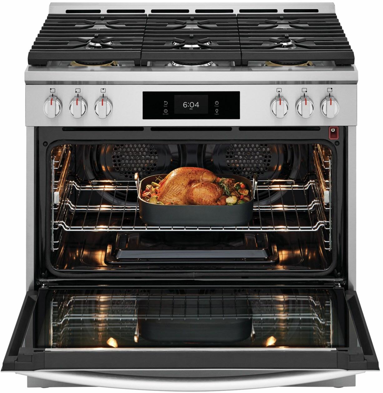 Frigidaire Gallery 36" Gas Range with Total Convection System enables cooking modes like Air Fry, Quick Preheat, Slow Cook, Steam Bake, Convection Bake and more! The flexible six burner cooktop offers ultimate cooking flexibility including two powerful 18,000 BTU Quick Boil Burners and a 5,000 BTU burner for simmering delicate foods. Also includes a temperature probe and Air Fry Tray and features our fingerprint resistant, Smudge-ProofStainless Steel finish.