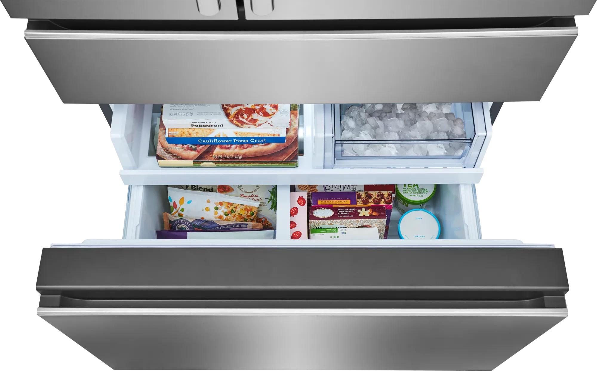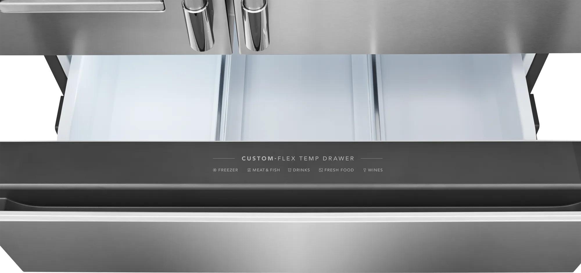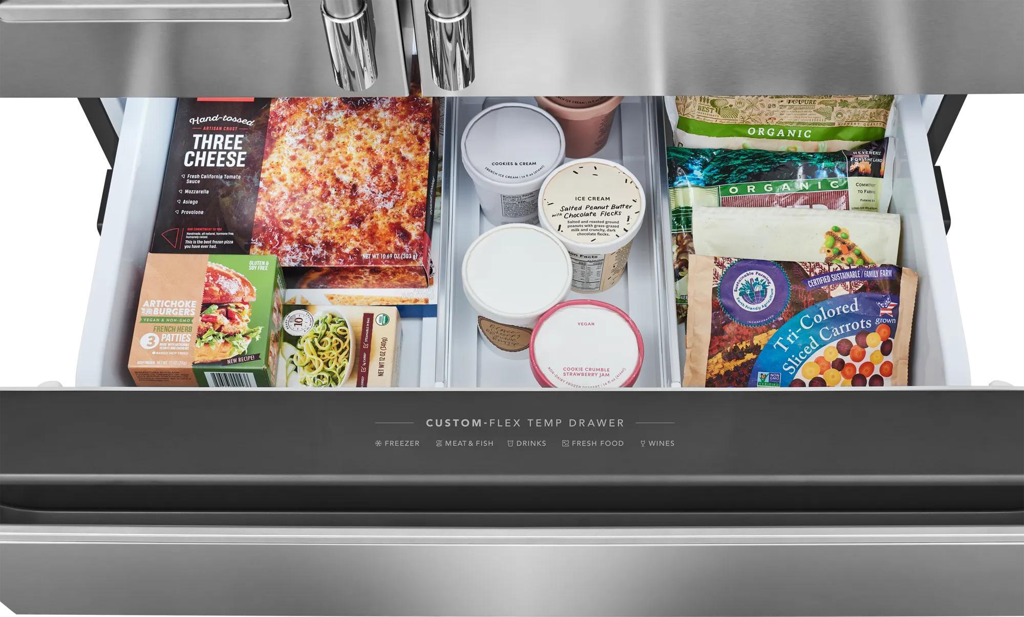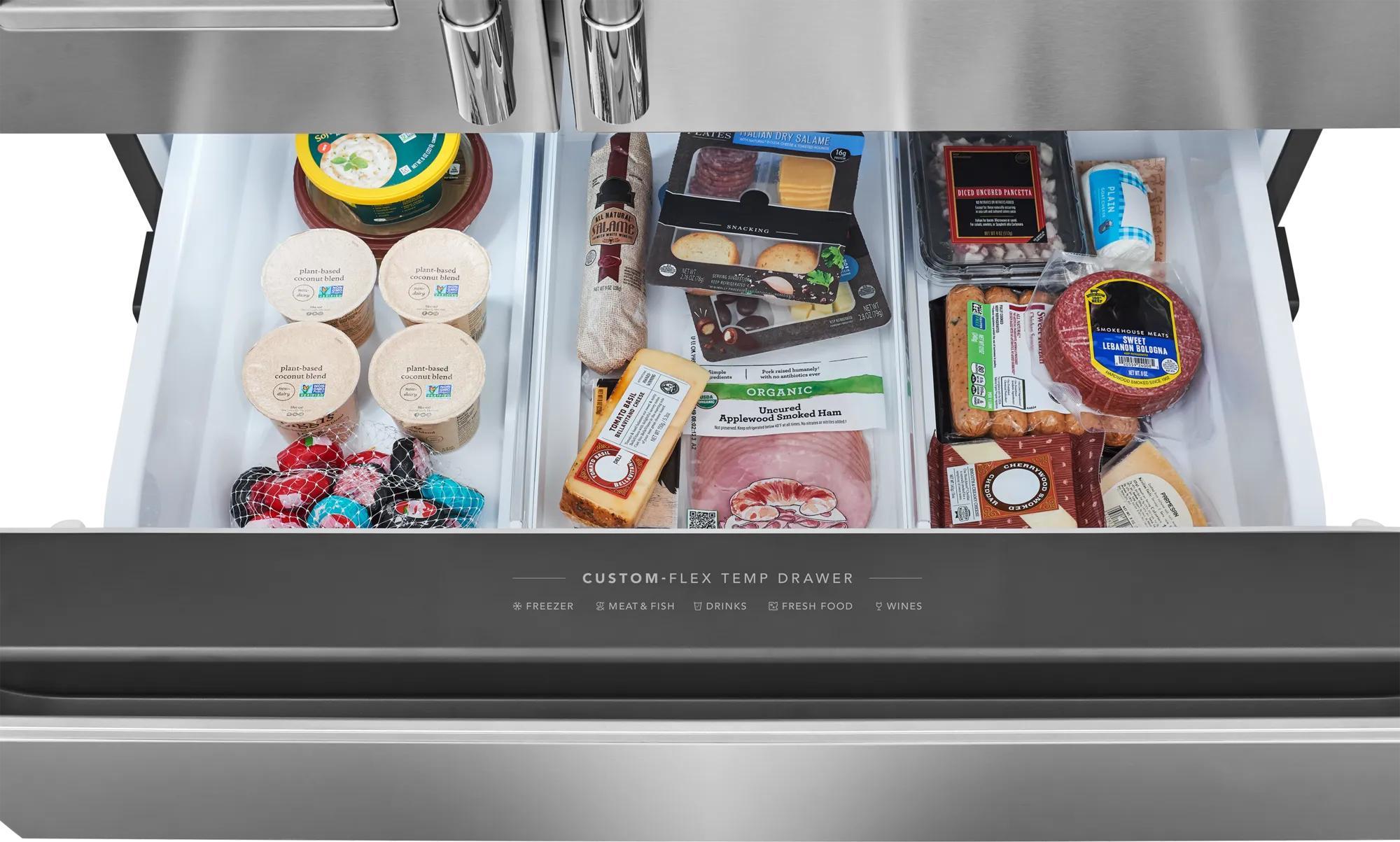 This Frigidaire Professional four-door French door refrigerator offers the Custom-Flex Temp Drawer so you can get extra space for all your most used items, from wine to frozen pizza. It helps keep produce crisp and flavorful for longer with CrispSeal Fresh crispers featuring 3 advanced technologies. Plus, it's easy to organize and clean with our clever organization system and Smudge-Proof Stainless Steel.