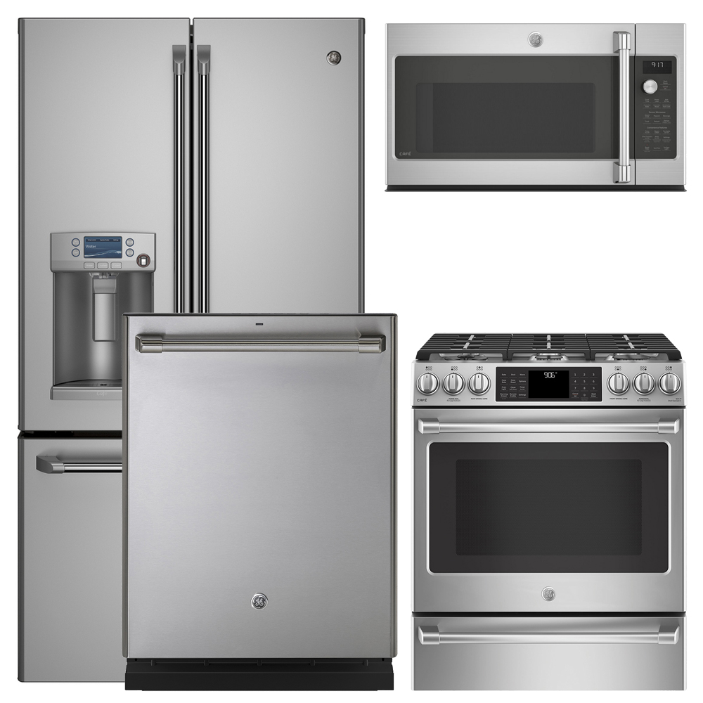 This appliance package from GE has everything you need to update your kitchen! Included with this package is a stainless steel french door refrigerator, stainless steel electric range, stainless steel over-the-range microwave, and stainless steel dishwasher.
