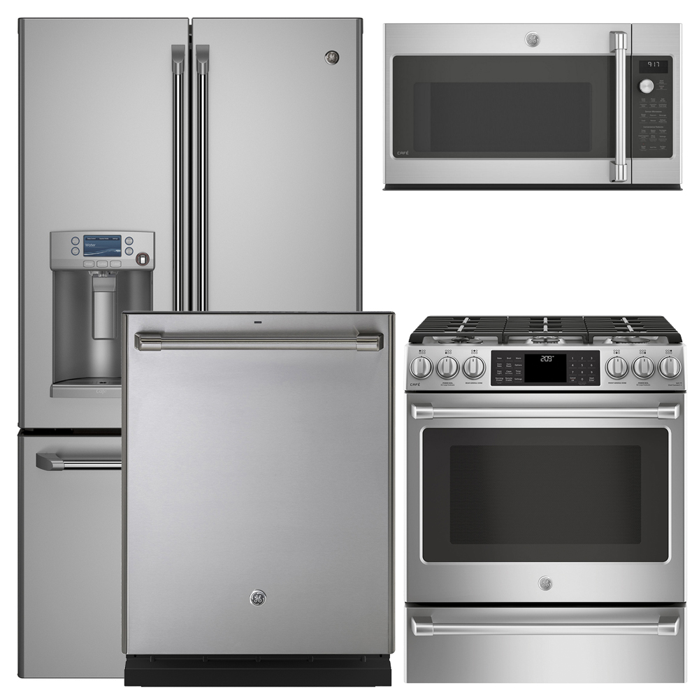 This appliance package from GE has everything you need to update your kitchen! Included with this package is a stainless steel french door refrigerator, stainless steel electric range, stainless steel over-the-range microwave, and stainless steel dishwasher.
