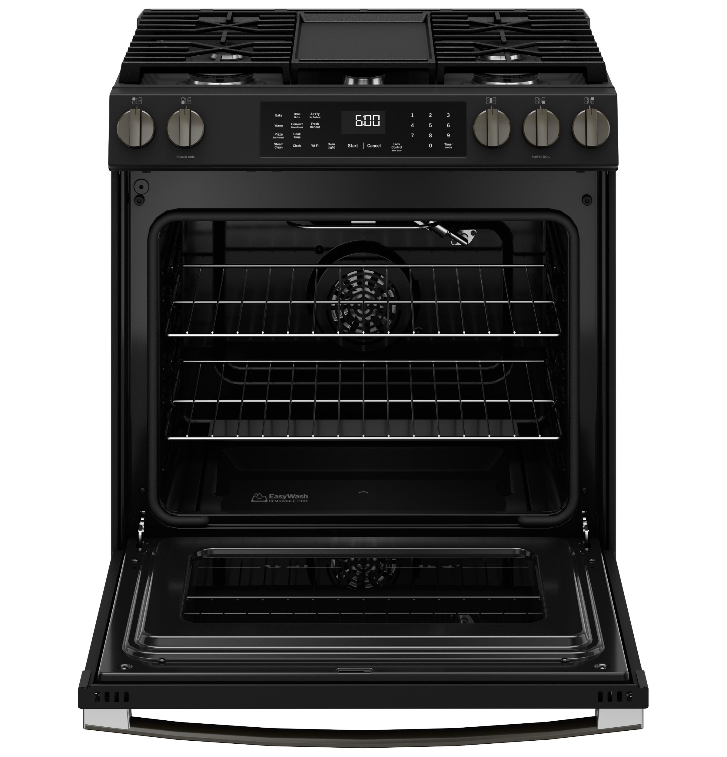 Oven cleaning is easier than ever with the EasyWash Oven Tray. This enameled tray is easily removed and rinsed clean in the sink or, for bigger messes, guaranteed to fit in all GE Appliances dishwashers.