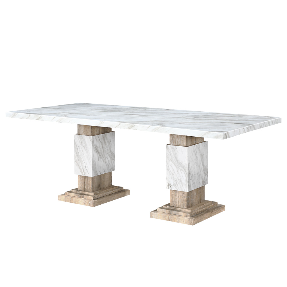 Elevate your dining space with modern elegance. Featuring a faux marble tabletop, natural wood base, and upholstered chairs with sophisticated Chanel tufting, this 5-piece set brings timeless style and everyday durability to your home.