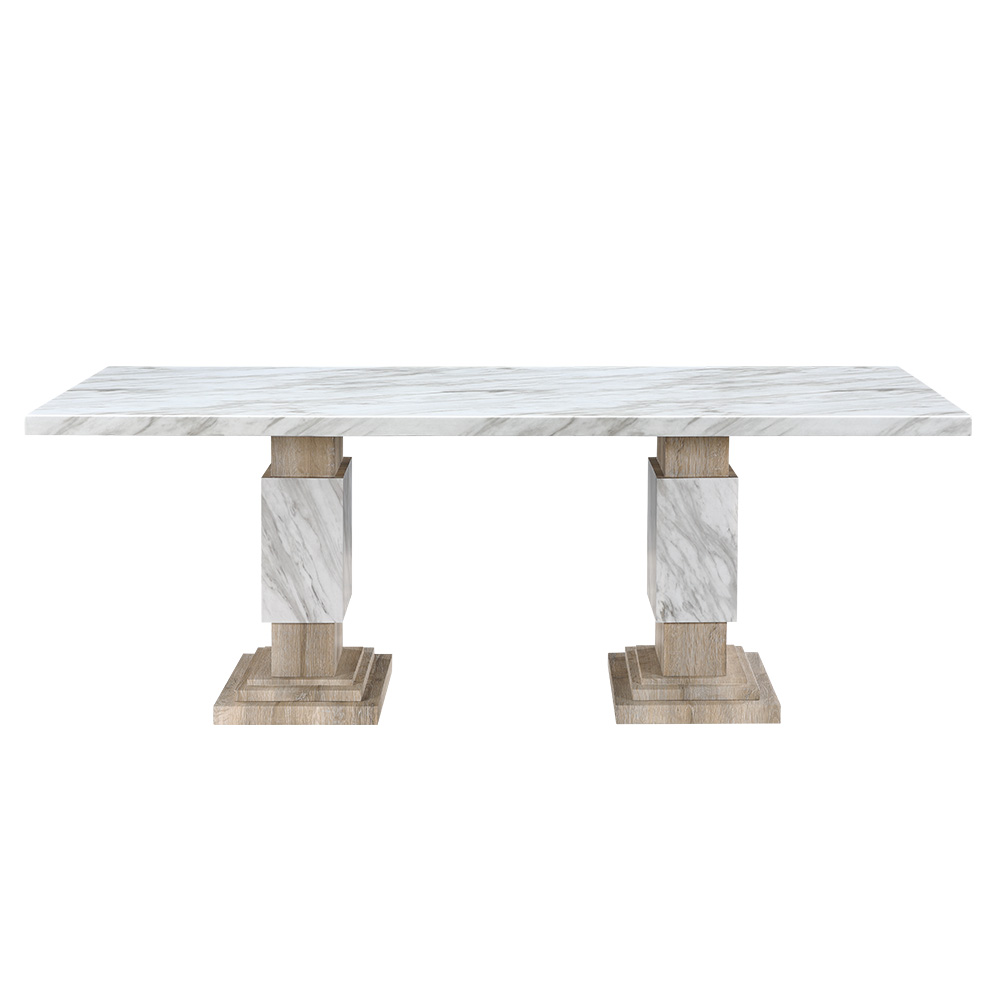 Introducing the Audrey Collection, a stunning and contemporary addition to your dining space. This exquisite set combines elegance and durability, perfect for both casual family meals and sophisticated dinner parties. The focal point of this set is the table, featuring a faux marble top that exudes timeless luxury. Its sleek natural wood tone base with faux marble accents adds a touch of modernity and complements any interior décor effortlessly. The chairs’ standout feature is the Chanel tufting on their backs, which adds a touch of sophistication and creates an eye-catching focal point.