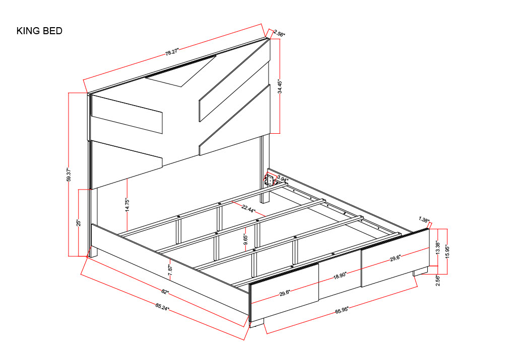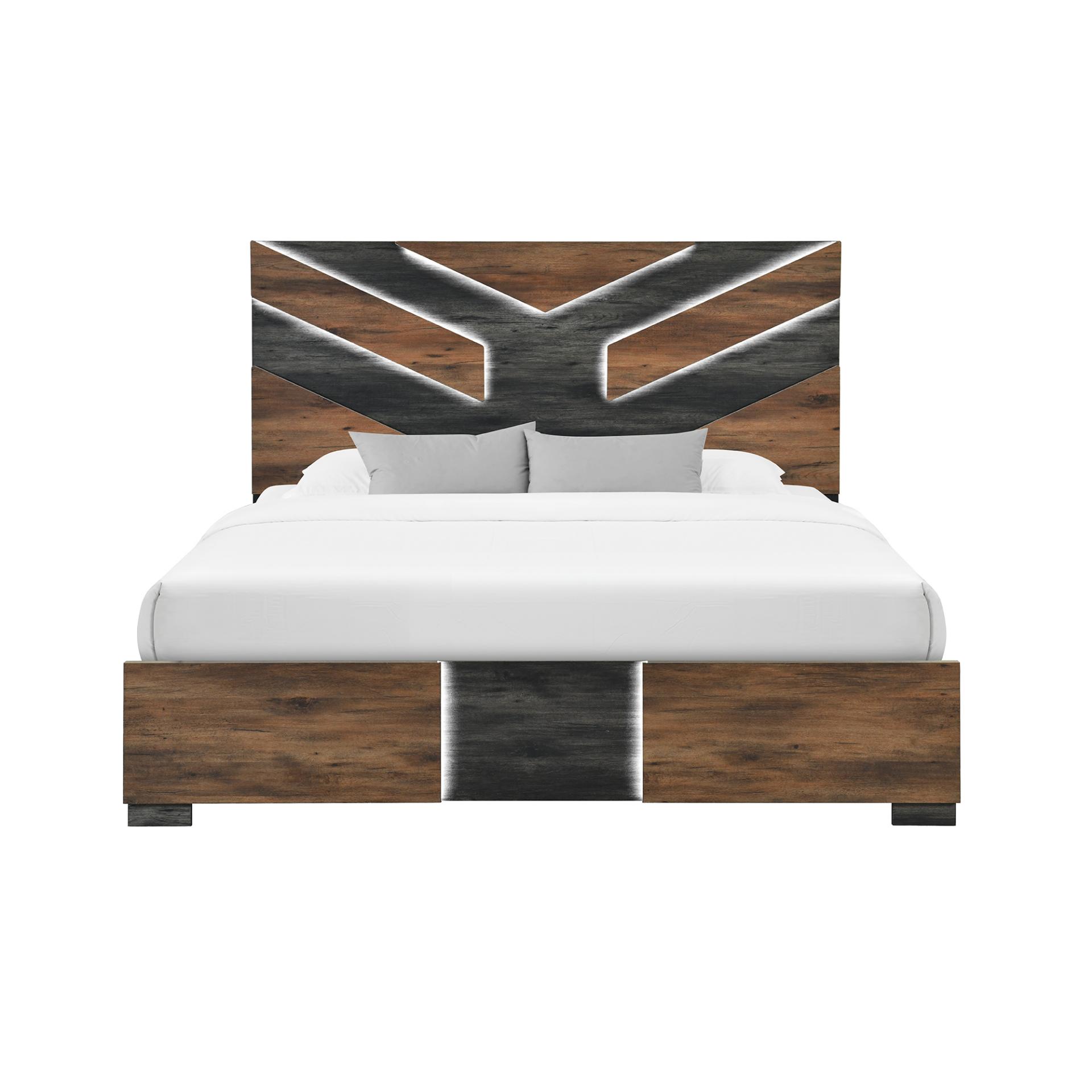 The makes a bold statement with its dramatic chevron-like patterned headboard and coordinating footboard, both accented by integrated LED lighting. Finished in a rich two-tone dark brown and walnut wood, this fully slatted bed blends warmth, texture, and contemporary design, creating a luxurious centerpiece for your bedroom.
