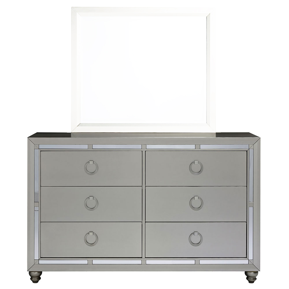 The Riley Silver Dresser features a sleek silver finish with mirrored accents and six spacious drawers for ample storage. Its elegant design pairs perfectly with the matching mirror, sold separately, making it an ideal addition to any modern bedroom.