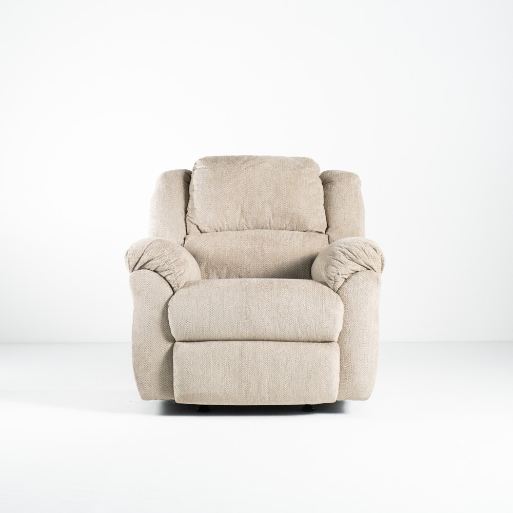 Relax in comfort with this manual rocker recliner, upholstered in soft Fawn fabric. With plush pad-over chaise seating, |solid foam arm pads, and an easy-care 100% polyester cover, it blends casual style with everyday durability. Proudly made in the USA.