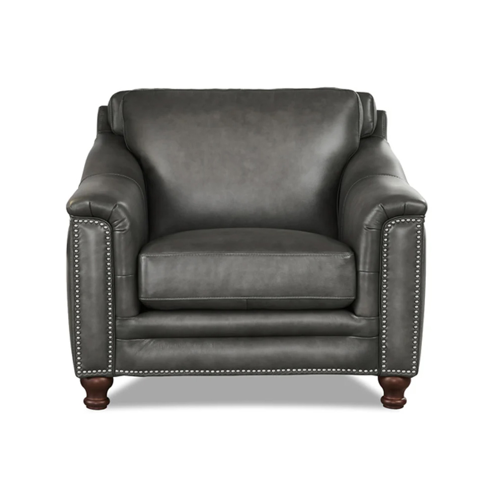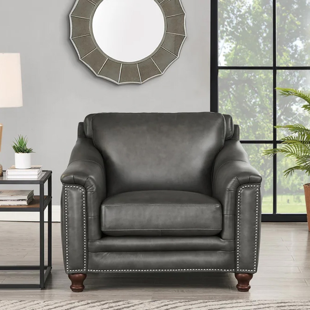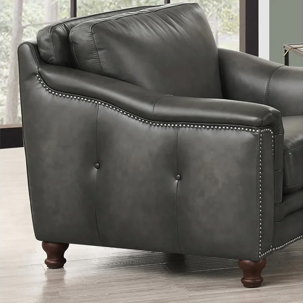 The Belfast Stationary Chair in ash top-grain leather blends classic detailing with everyday comfort. Featuring a curved back, sloping arms, nail-head trim, and button-tufted sides, it mirrors the refined design of the Belfast collection. Built with a kiln-dried hardwood frame and premium feather-down seating, it offers lasting durability and timeless appeal.