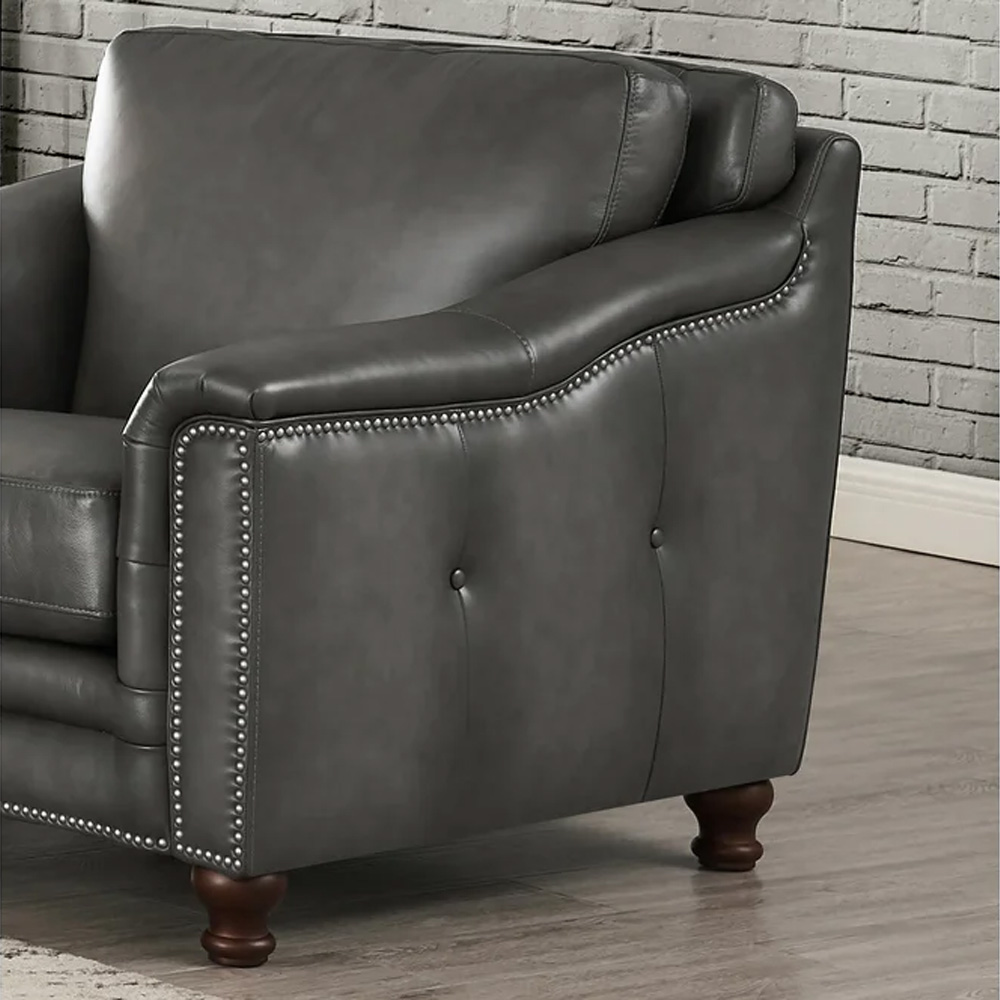 • Premium Leather: Top-grain leather is upholstered on the seating areas and armrests. Split-grain leather is used on the sides and back.