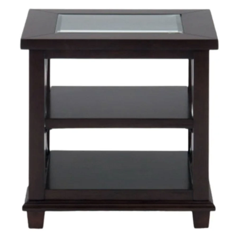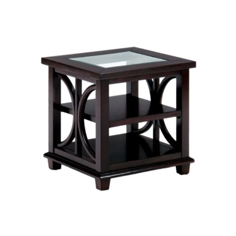 The Panama End Table by Jofran adds contemporary elegance with its circular lattice base, beveled glass top, and rich dark finish. Crafted from solid Asian hardwood with cherry veneers, it’s a stylish and durable accent for any living room.