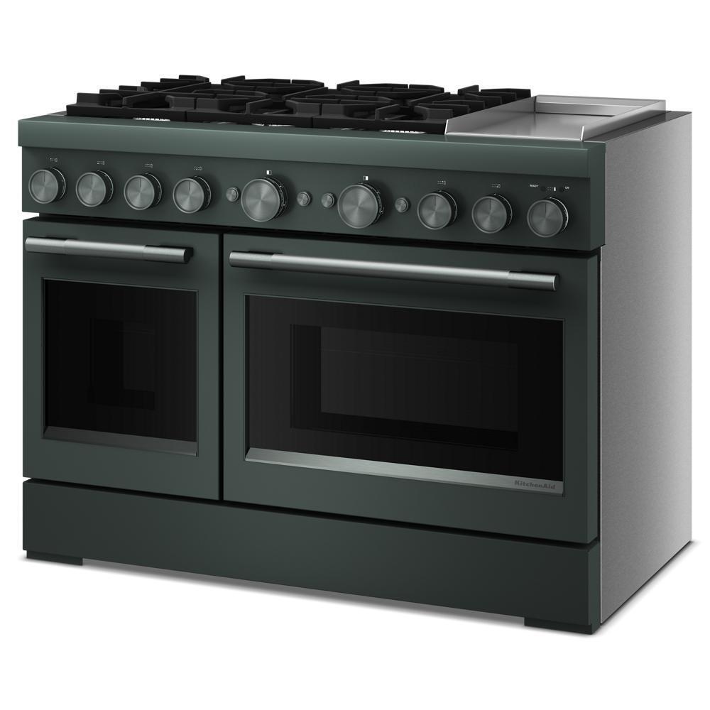 Satisfy your craving to create with a 48-inch KitchenAid Commercial-Style Range with Chrome Electric Griddle. This dual fuel range combines an electric double oven with a 6-burner gas cooktop. Two 20,000 BTU Ultra Power Dual-Flame Burners offer power and precision to successfully sear, simmer, stir-fry and saut. Even-Heat True Convection gives consistent baking and roasting, plus air fry mode that yields crispy, golden results.