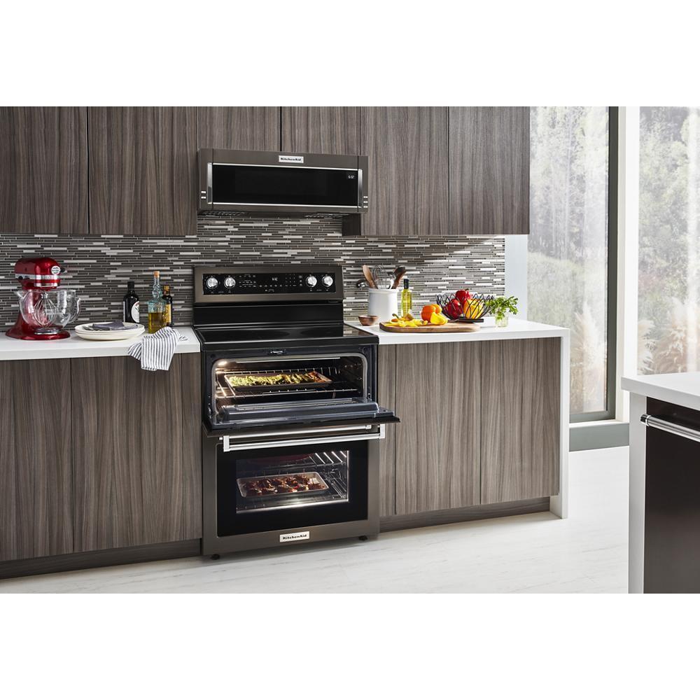This beautiful electric double oven range produces flawless cooking results with Even-Heat True Convection. The unique bow-tie design and convection fan ensure the inside of the entire oven is heated to, and stays at, the perfect temperature. The ovens are a combined 6.7 cu ft., providing an extra-large capacity and separate temperature environments. The cooktop features five heating surfaces, including a dedicated warming zone, allowing you to do more on your range.