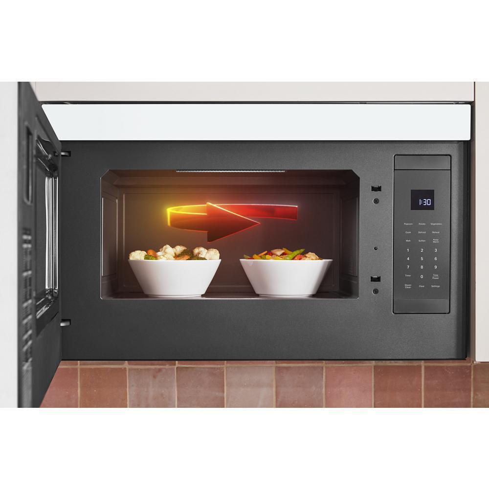 KitchenAid Over-The-Range Microwave with Flush Built-In Design fits evenly with cabinets to give your kitchen a seamless look and feel, with a turntable-free interior that can heat multiple items at a time.* *when installed in standard cabinet depth of 12 3/4 .
