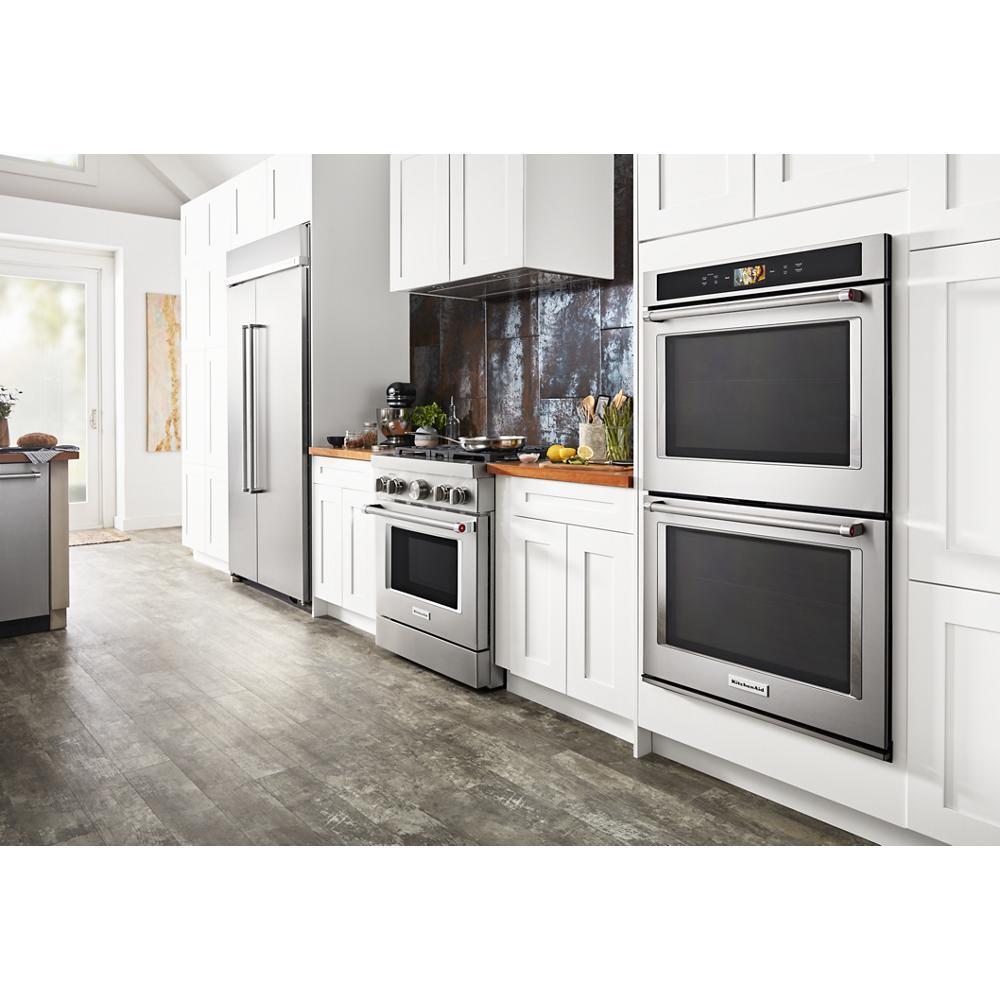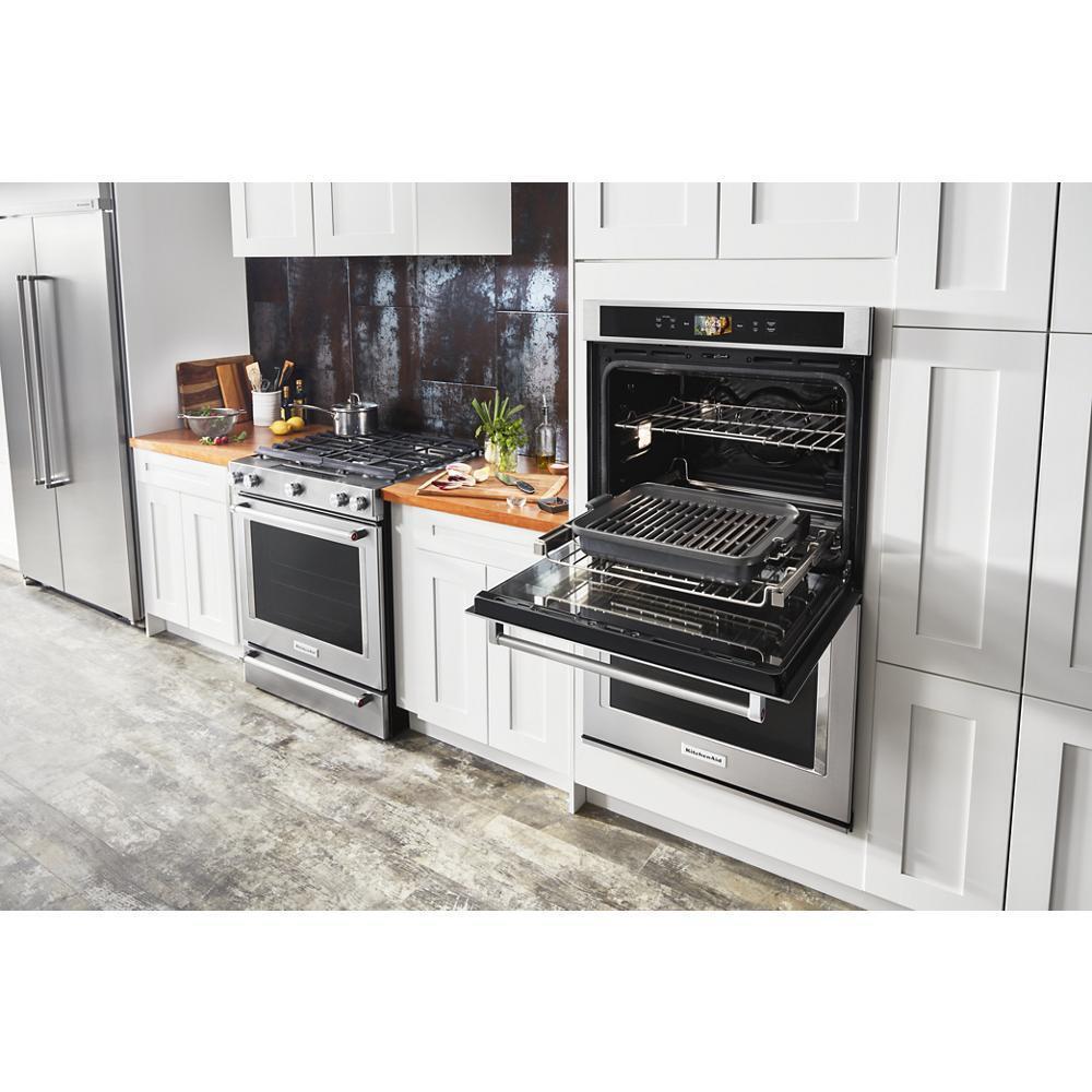 Open up new culinary possibilities. KitchenAid introduces the first double wall oven that comes with interchangeable attachments in the tradition of the iconic KitchenAid Stand Mixer to enable grilling, stone cooking and steaming. As cooks expect today from a premium wall oven, it also supports a full complement of smart capabilities as well as baking, broiling and Even-Heat True Convection.