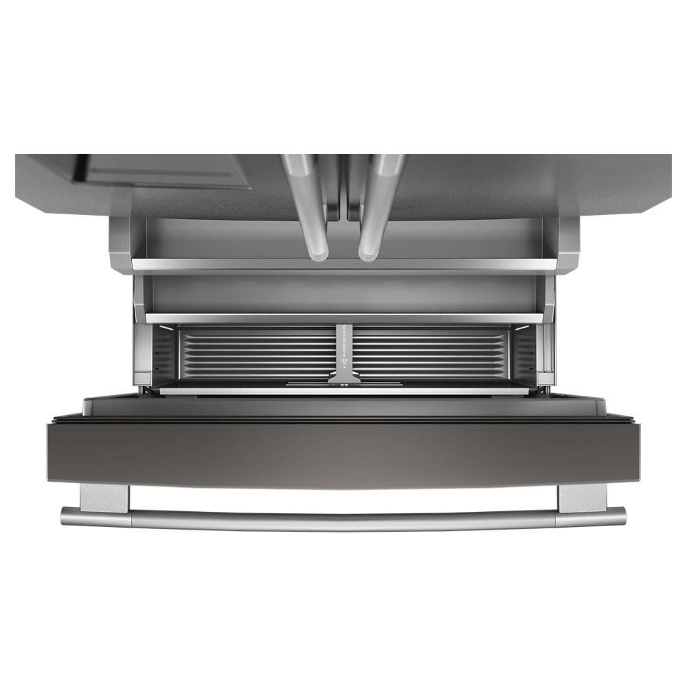 Feed your creativity with the KitchenAid French Door Bottom Mount Refrigerator External Water Dispenser. Load up to three bottles of wine or make room for more ingredients with a Removable Wine Rack, and keep your food fresh and flavorful with the Preserva Food Care System, FreshChill Temperature-Controlled Full-Width Pantry Drawer featuring temperature presets and fully extendable FreshSeal Humidity-Controlled Crisper Bins. Plus, with True Counter Depth, your refrigerator seamlessly fits into your kitchen with a seamless, built-in look.* *Not including doors when installed in standard 25 1/2" cabinet and countertop