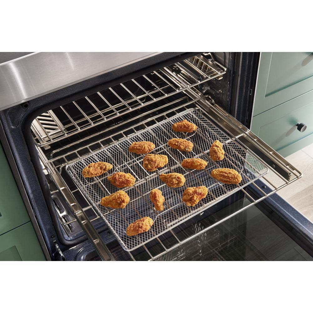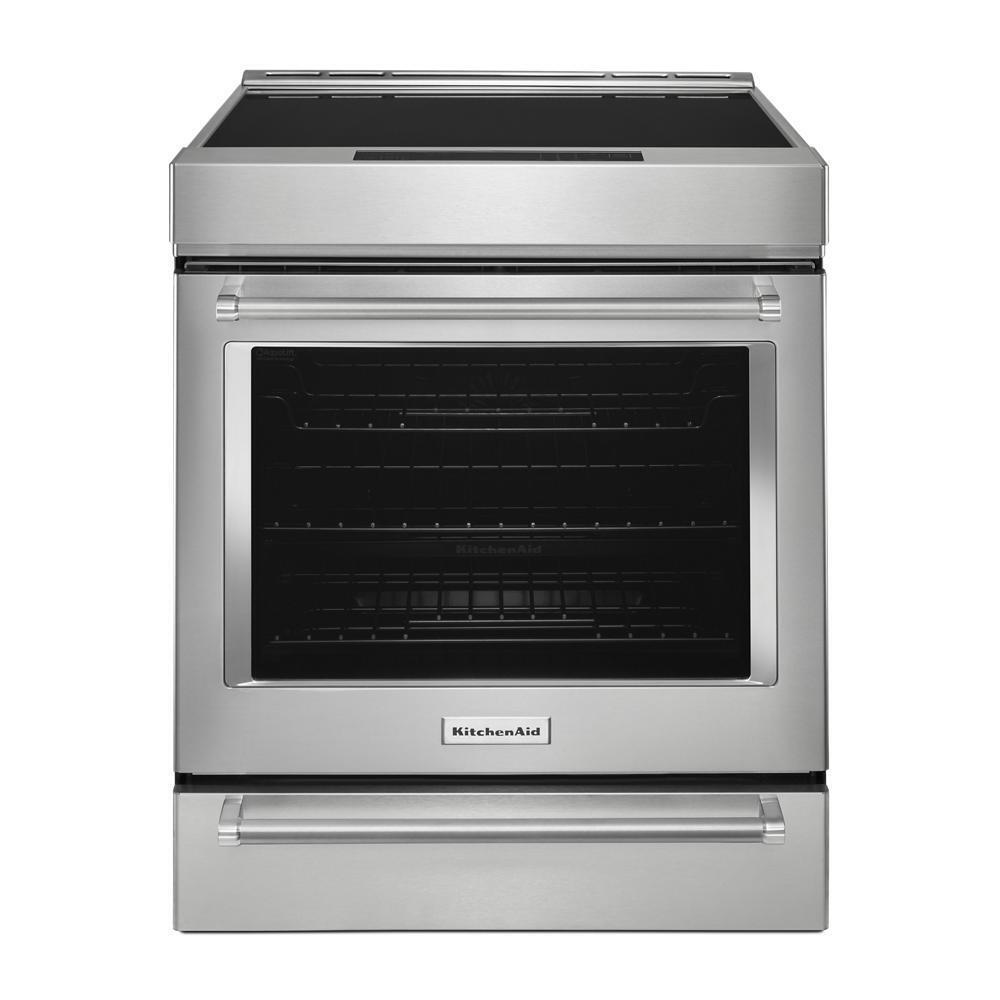 This KitchenAid 6.4 cu. ft. 30-inch 4-Element Induction Slide-In Convection Range combines the precision of induction with the power of Air Fry. Sensor-induction cooktop generates heat directly within cookware, and the oven features Even-Heat True Convection plus air fry mode, with an included dishwasher-safe air fry basket that aids in crisping and browning.