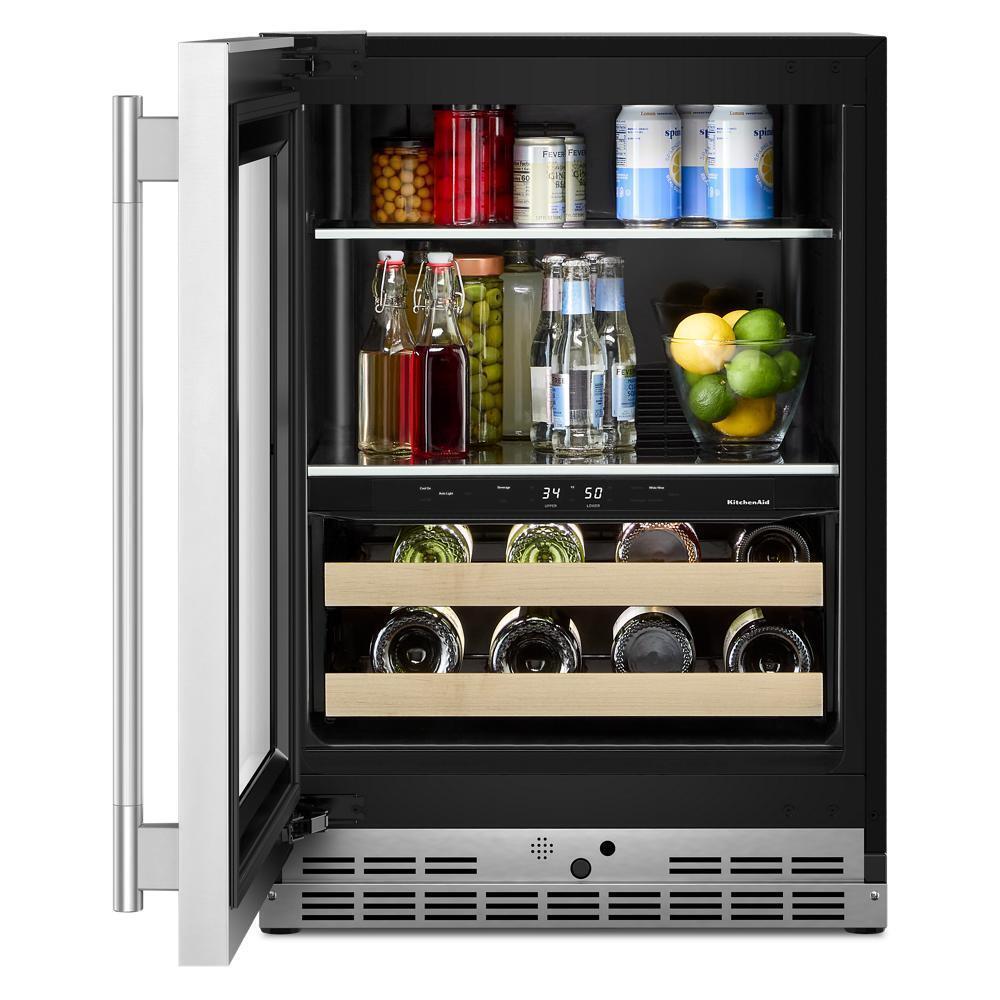 This 24" Undercounter Beverage Center with Full-Extension Wood-Front Racks stores 14 wine bottles below with room for drinks and food on the full-width shelves above. Two Temperature-Controlled Zones adjust for what you re storing, and a Temperature Monitoring System with sensor alert adds peace of mind. Fully Flush Installation with Hidden Hinges provides a built-in look within cabinetry.
