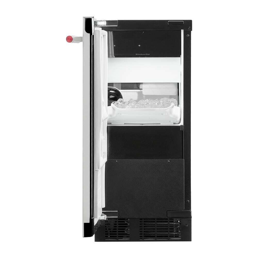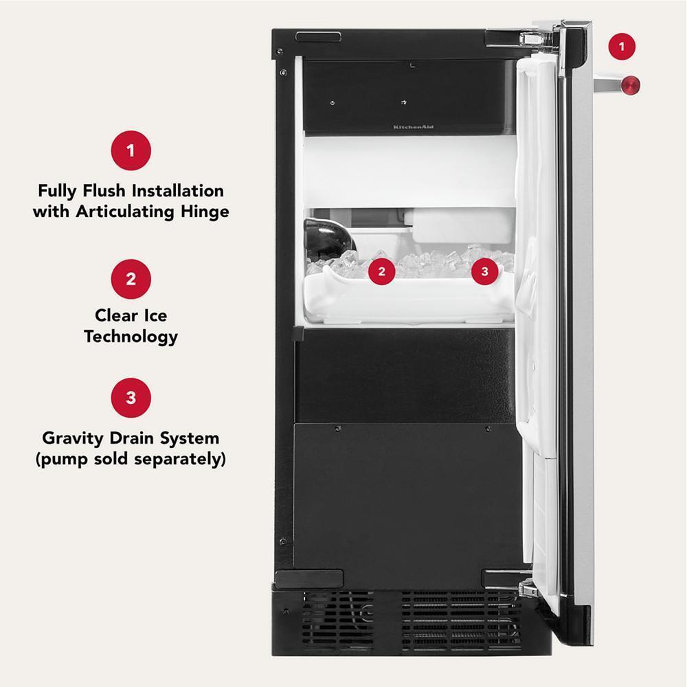 This 15" automatic ice maker uses Clear Ice Technology to produce uniformly shaped, crystal clear ice cubes that enhance the largest-and smallest-occasions. Its distinctive styling complements other KitchenAid appliances with Fully Flush Installation for a seamless, built-in look. The signature handle design can be personalized to your aesthetic, while the storage bin holds up to 25 pounds of ice for added convenience.