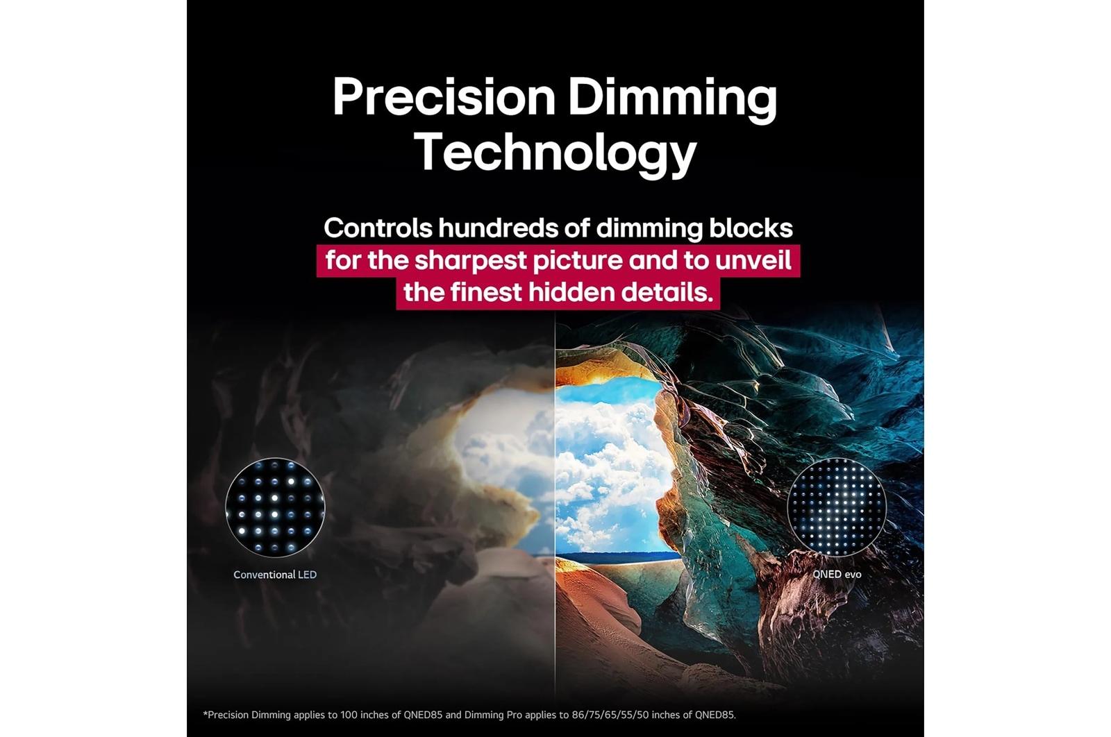 • LG Dimming Pro controls MiniLEDs with dimming zones that can be individually controlled for better black levels and brighter colors (except for 100” QNED85A which uses Precision Dimming).