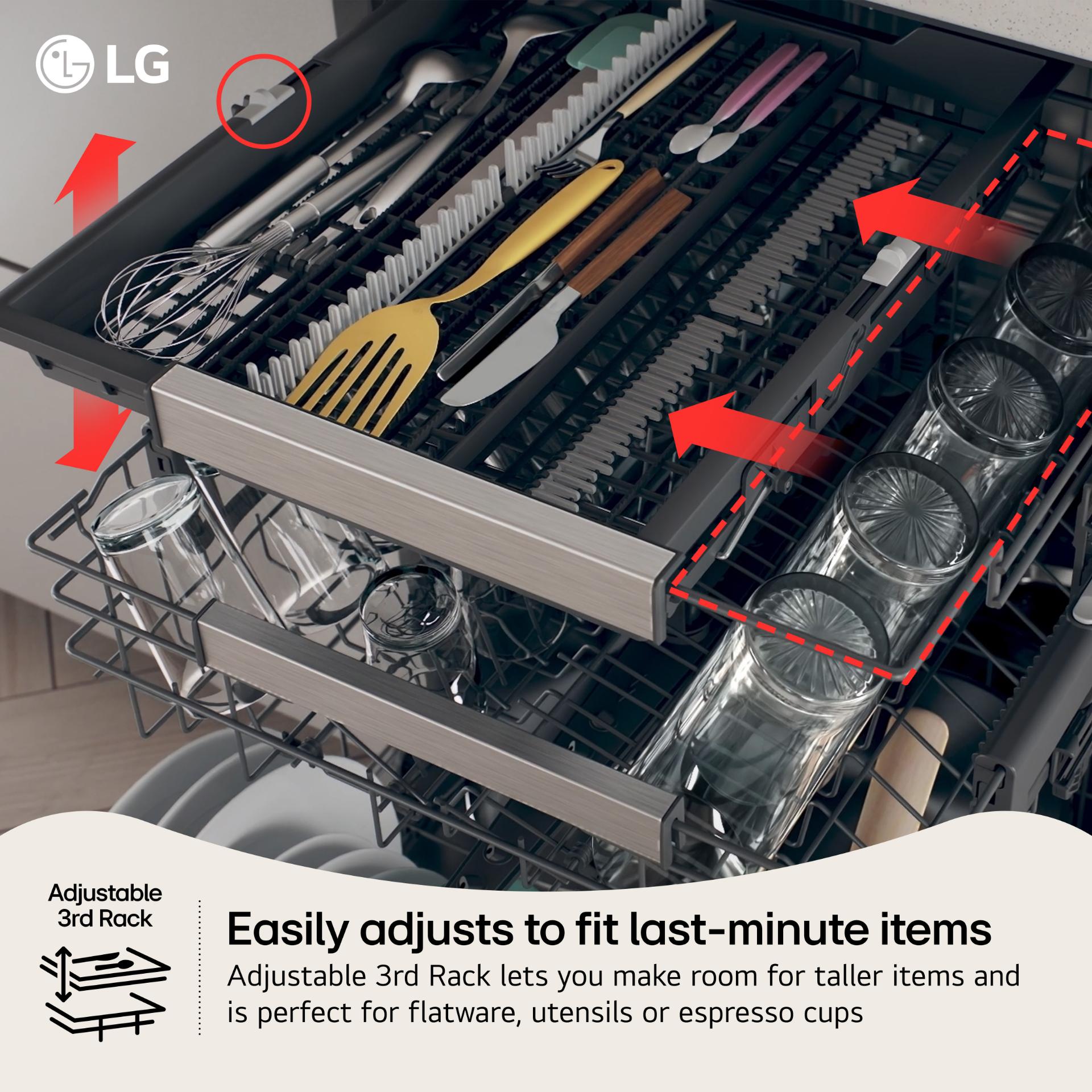 • The Height Adjustable 3rd Rack with a smooth Glide Rail lets you easily make room for taller items, even when fully loaded, and is perfect for flatware, utensils, or espresso cups.