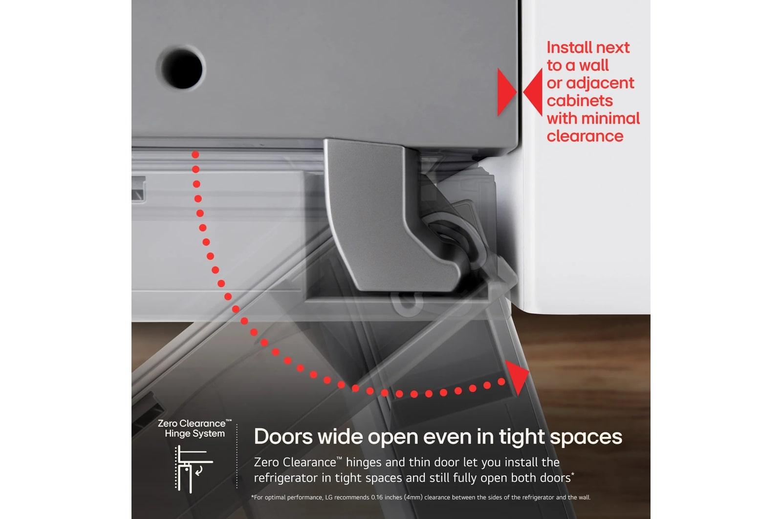 Zero Clearance(TM) hinges let you install your refrigerator next to a wall or adjacent cabinets for a nearly built-in look. Combined with the thin door design, it lets you fully open both French doors, even in tight spaces. That means there's almost zero need to pull the refrigerator forward or leave additional room on the sides to avoid hitting surrounding cabinetry-and take up extra space in your kitchen.