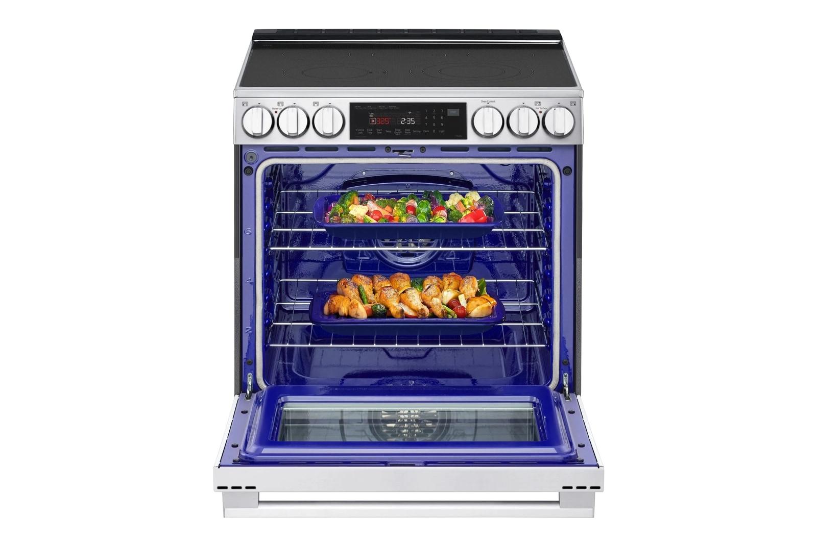 LG ProBake Convection(R) brings pro technology home with a combined two-speed fan and ultra-powerful rear heating element. The oven mode automatically selects the lower speed for delicate baking or the higher speed for air frying and roasting. The result is faster preheating, quicker cooking and more even baking on multiple racks at the same time. And with no bottom heating element, cleaning up baked-on spills and splatters is much easier. 1