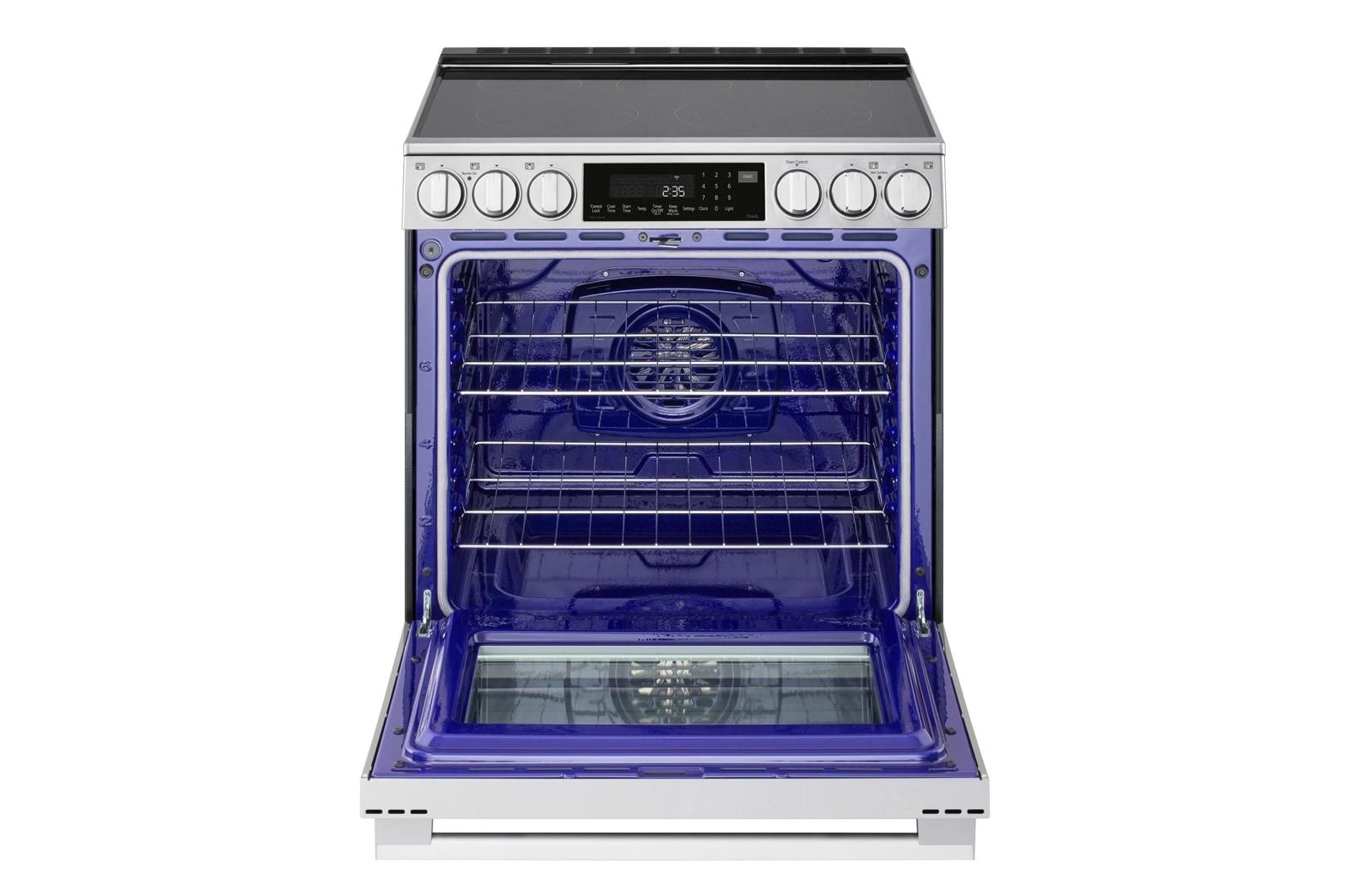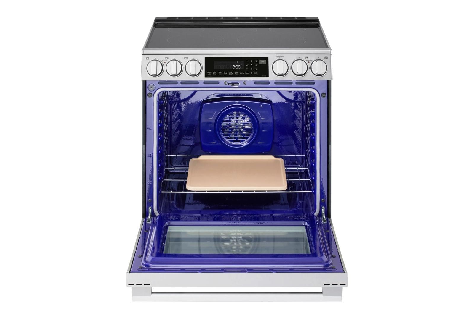 LG ProBake Convection(R) brings pro technology home with a combined two-speed fan and ultra-powerful rear heating element. The oven mode automatically selects the lower speed for delicate baking or the higher speed for air frying and roasting. The result is faster preheating, quicker cooking and more even baking on multiple racks at the same time. And with no bottom heating element, cleaning up baked-on spills and splatters is much easier. 1