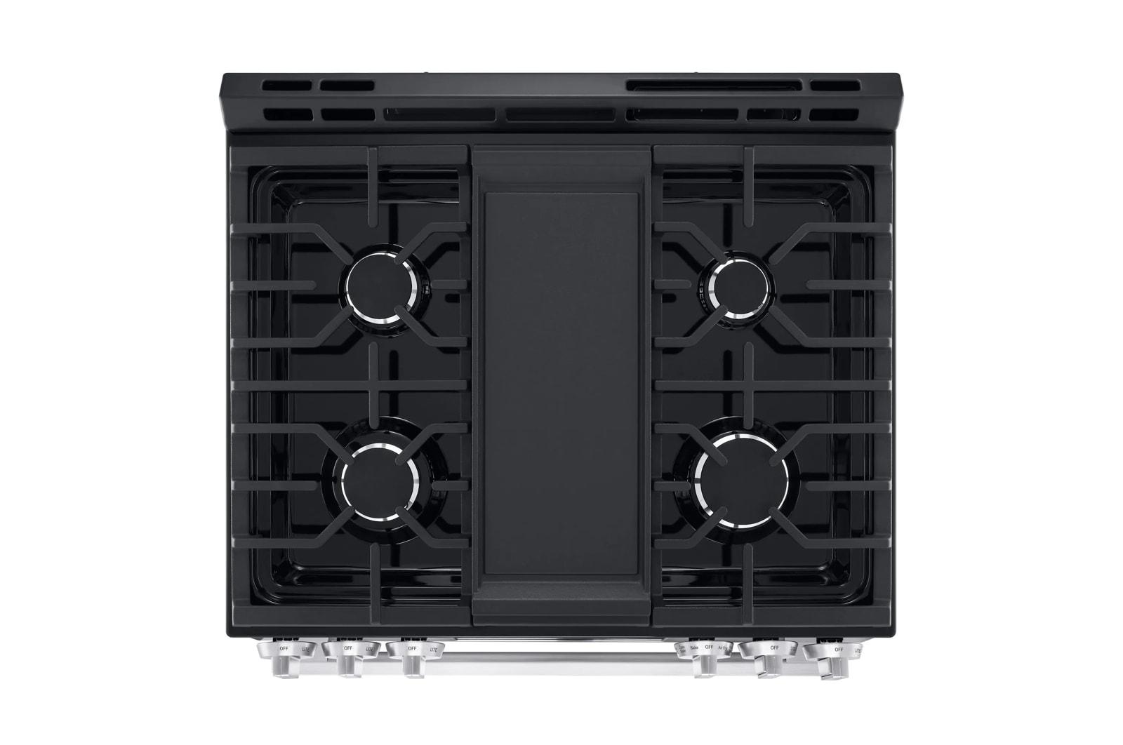 • From big pans to small pots, oblong cookware to oversize griddles, the wide grate design of this LG gas range has room for them all. Rectangular grates cover more of the cooktop surface so you can use all 5 burners at once without performing a balancing act with your pans. Perfectly practical-the heavy duty grates extend from edge to edge to blend in with surrounding countertops and lend a premium look to your kitchen.